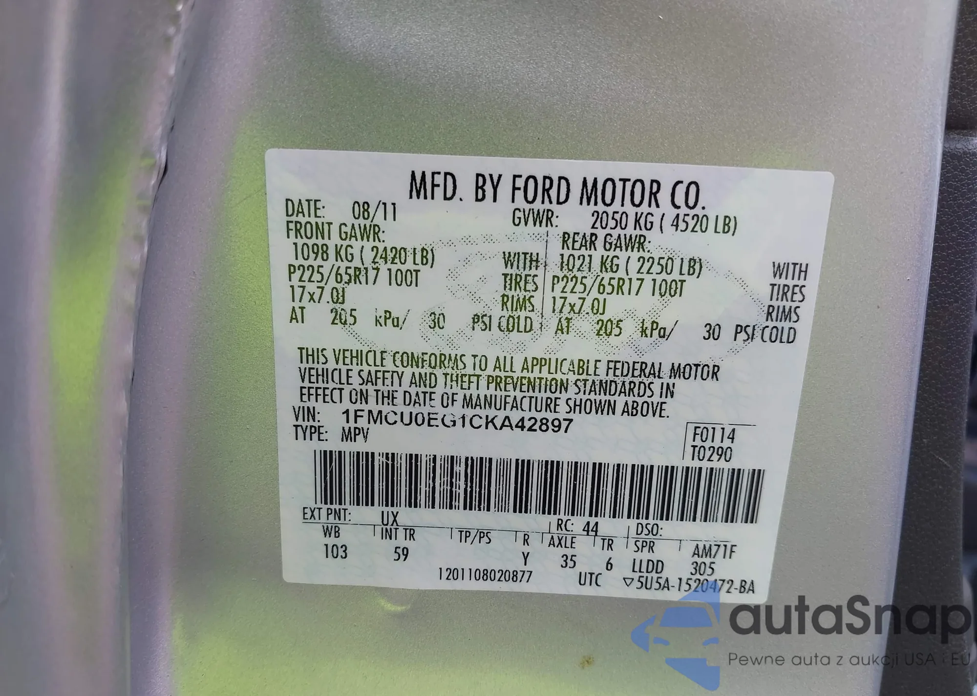 • VIN 1FMCU0EG1CKA42897