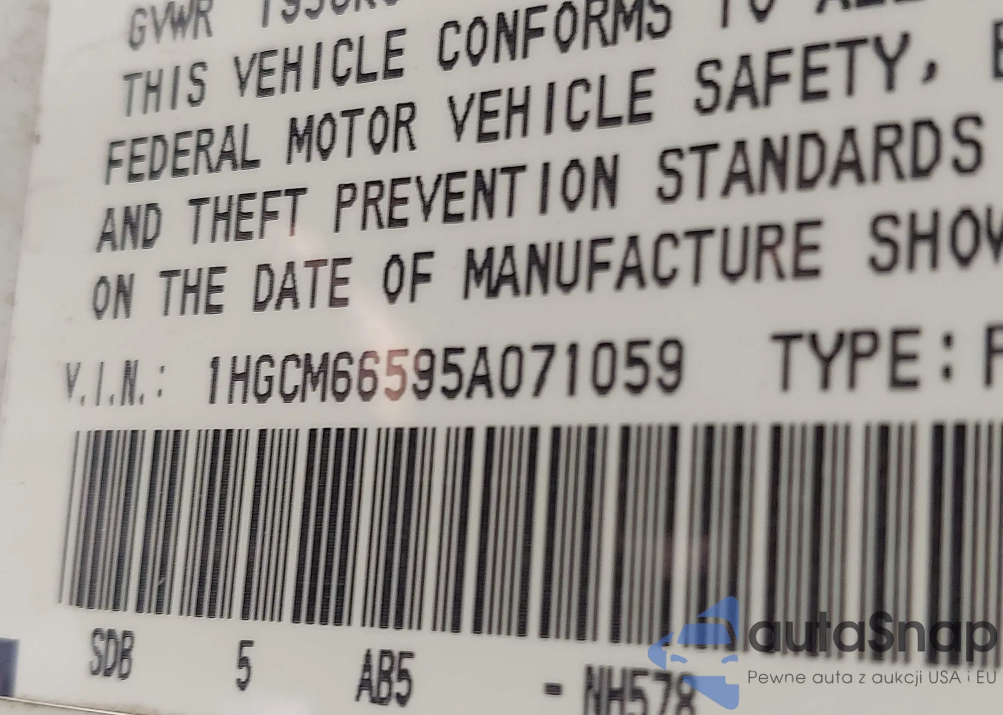 LOT: 42318510 VIN: 1HGCM66595A071059