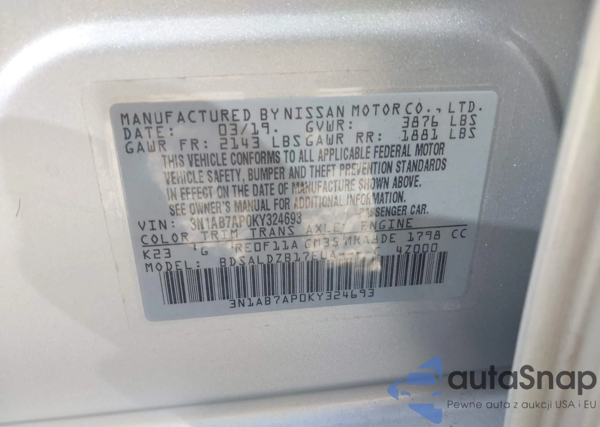 LOT: 40700356 VIN: 3N1AB7AP0KY324693
