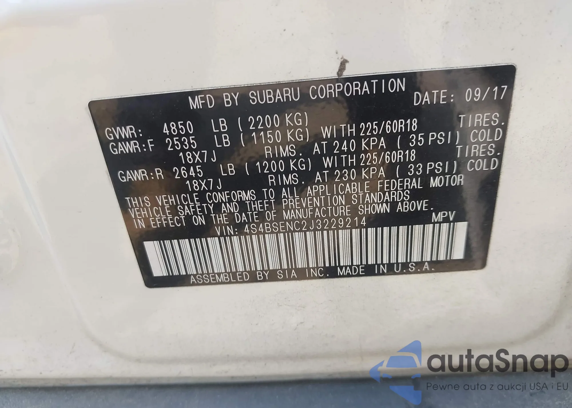LOT: 42613809 VIN: 4S4BSENC2J3229214