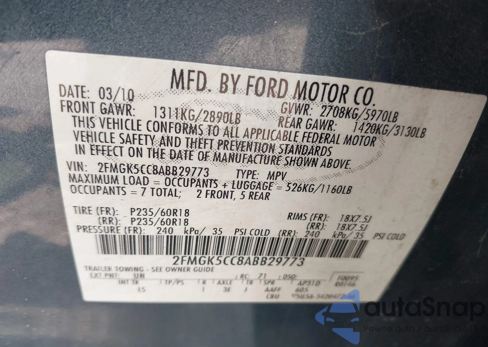 LOT: 42604076 VIN: 2FMDK4KC0ABA13398