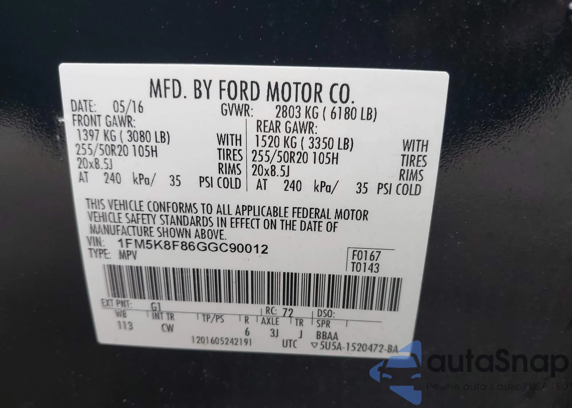 LOT: 42557512 VIN: 1FM5K8F86GGC90012