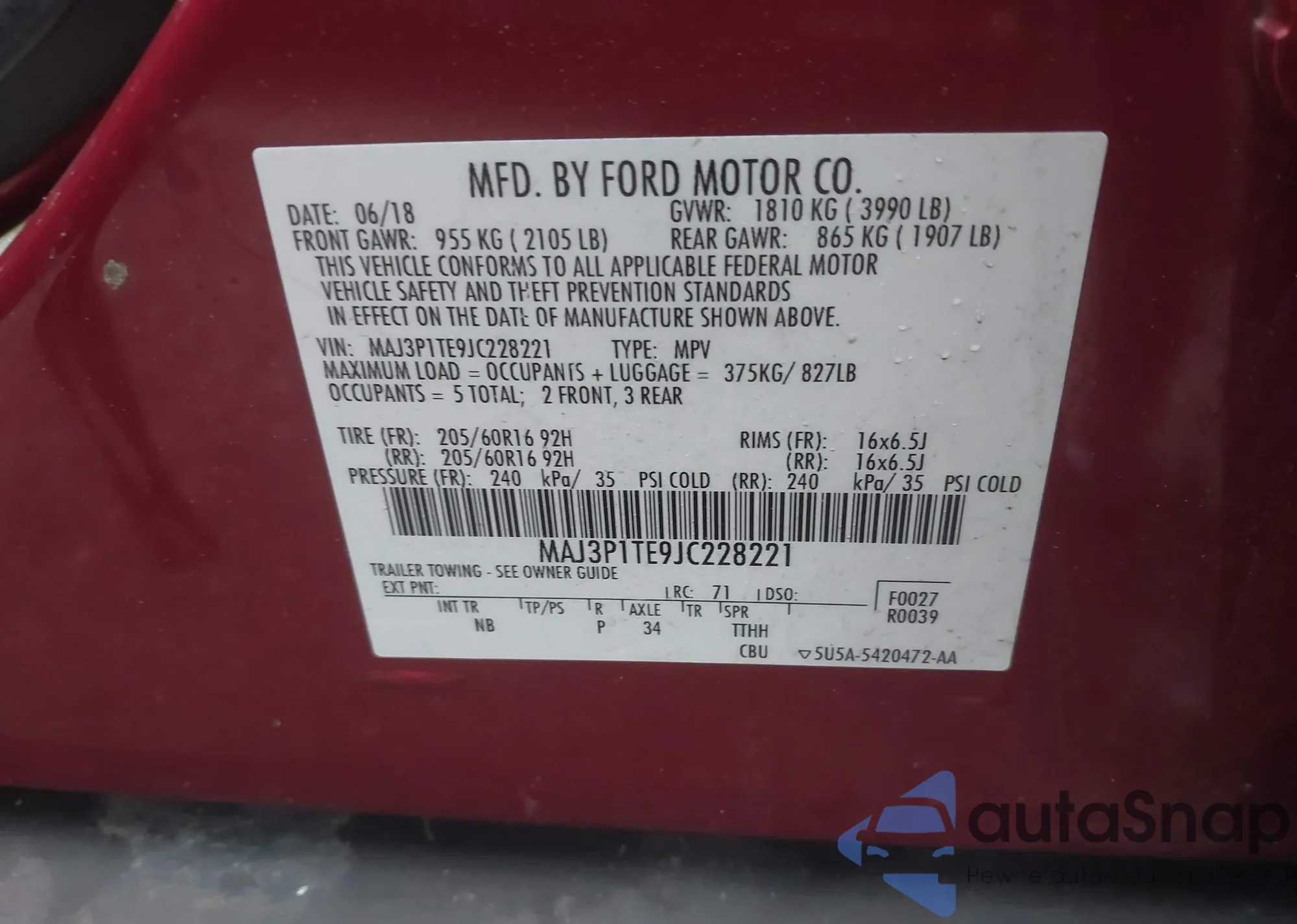 LOT: 42576007 VIN: MAJ3P1TE9JC228221