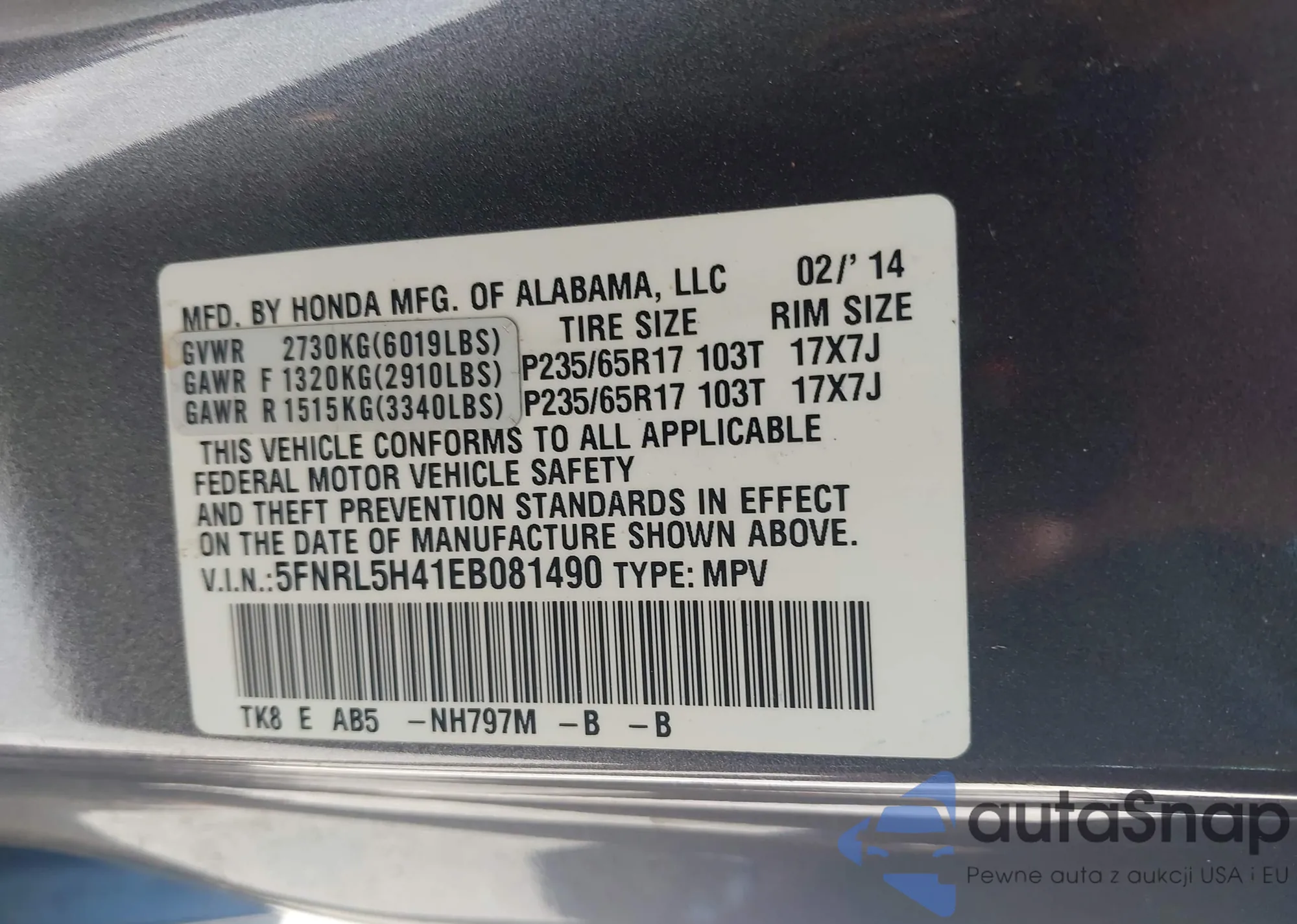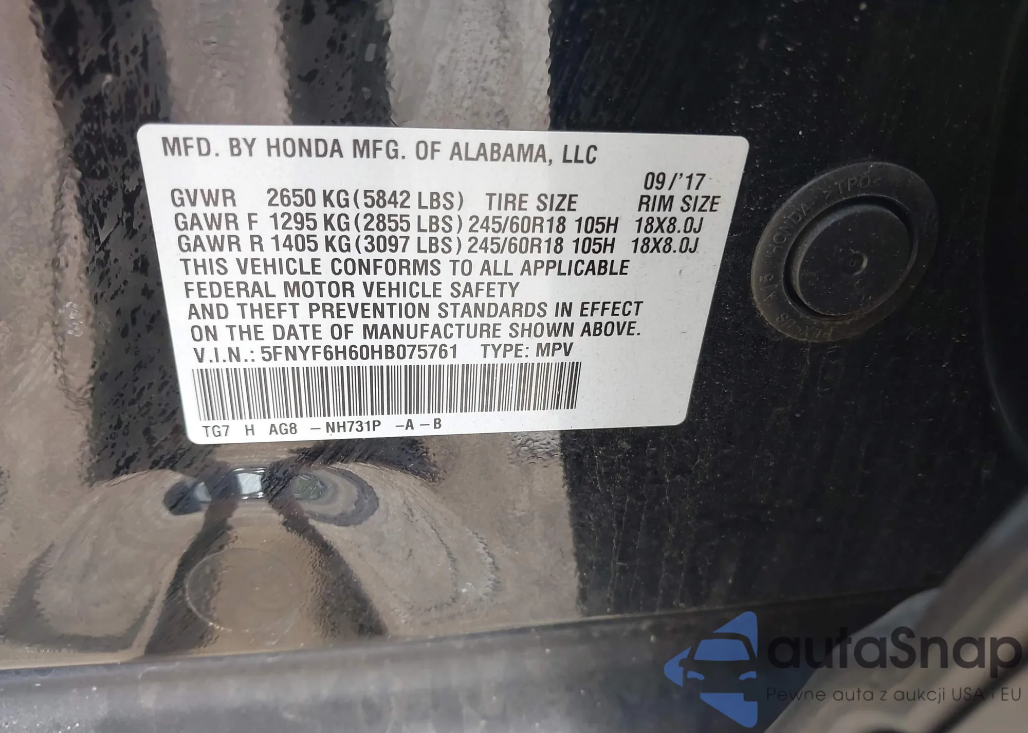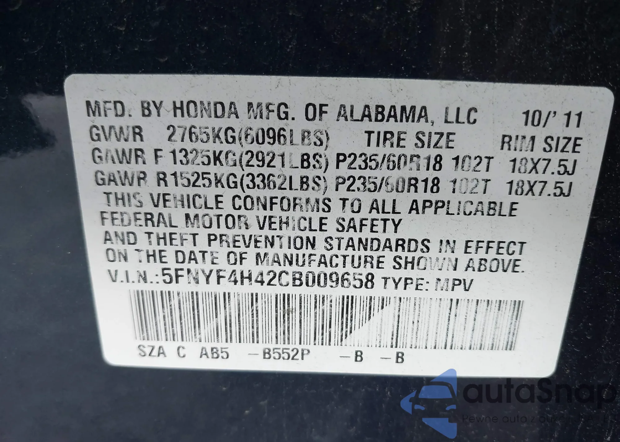 • VIN 5FNYF4H42CB009658