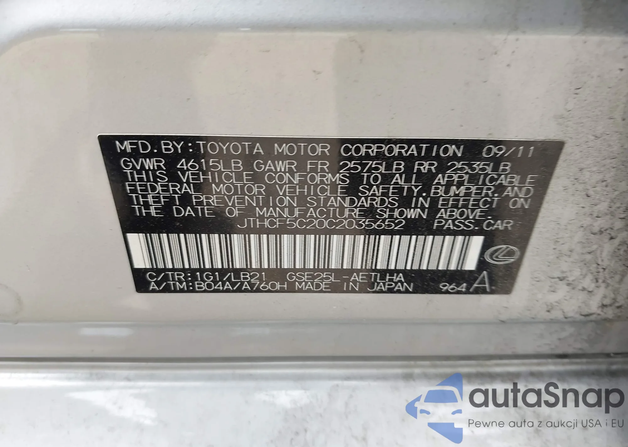 LOT: 42288885 VIN: JTHCF5C20C2035652