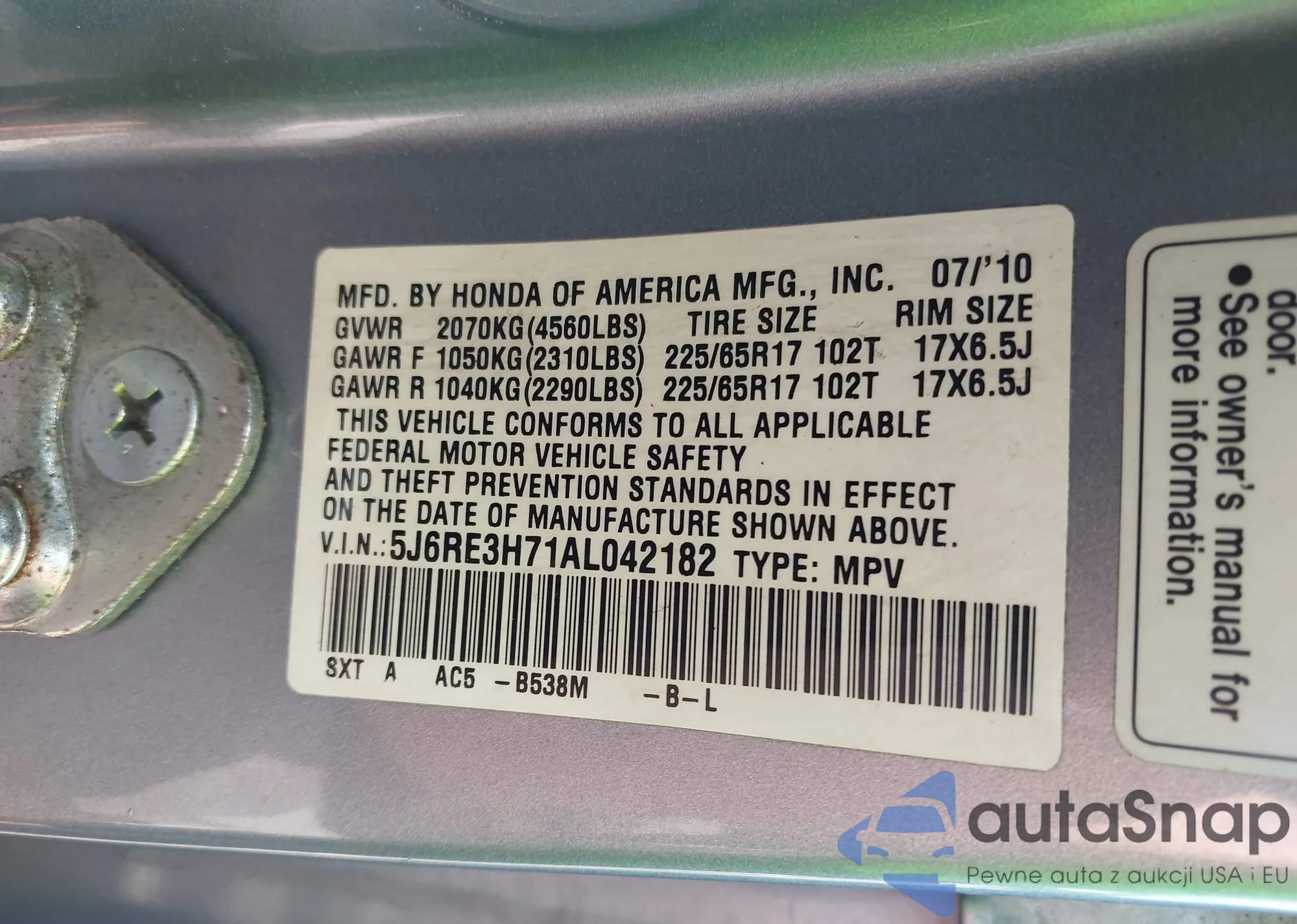 • VIN 5J6RE3H71AL042182