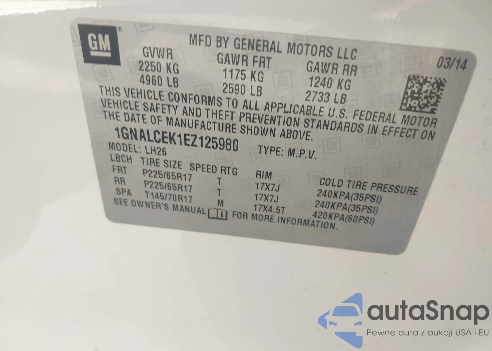 LOT: 42573430 VIN: 1GNALCEK1EZ125980