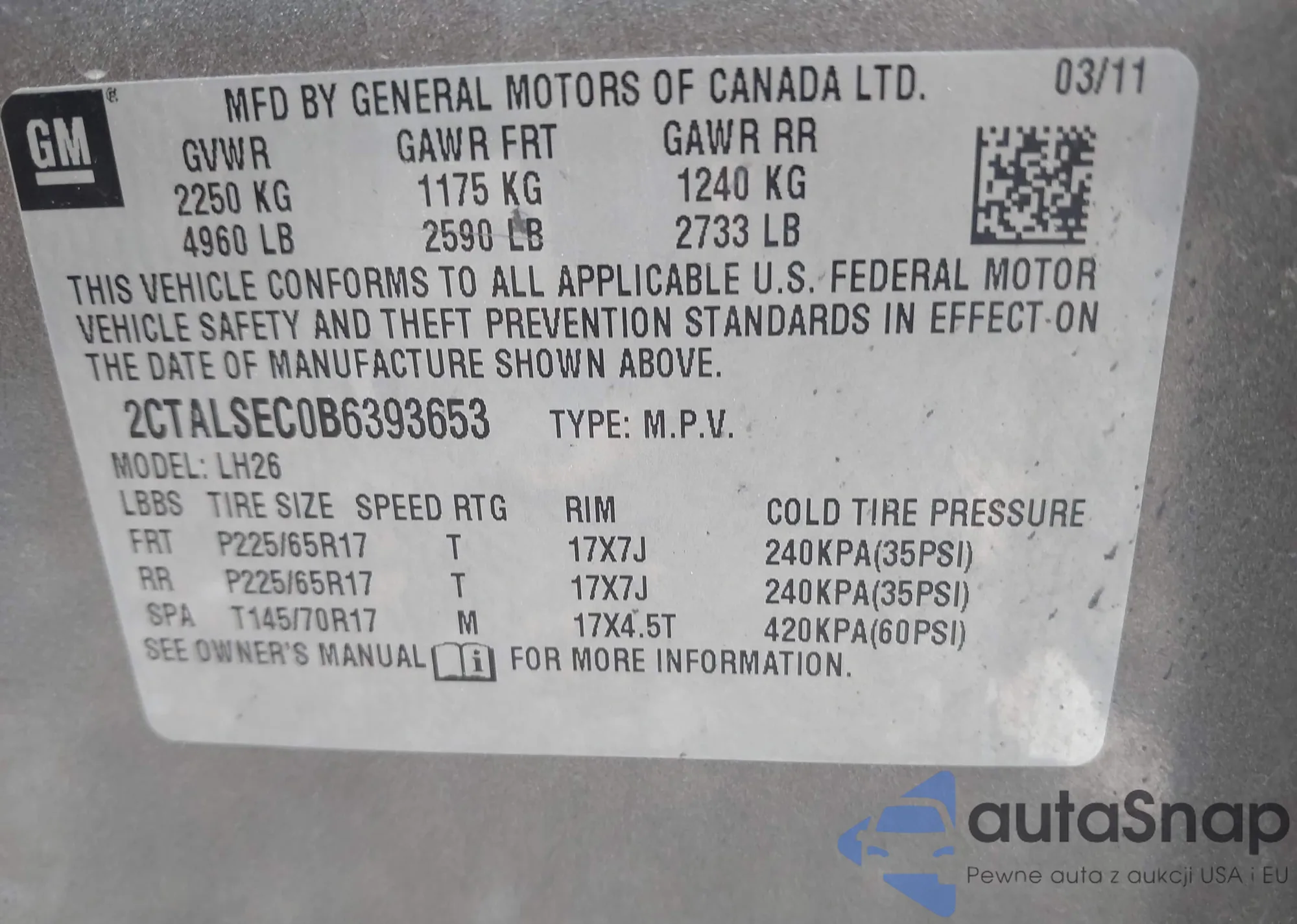 LOT: 42187359 VIN: 2CTALSEC0B6393653