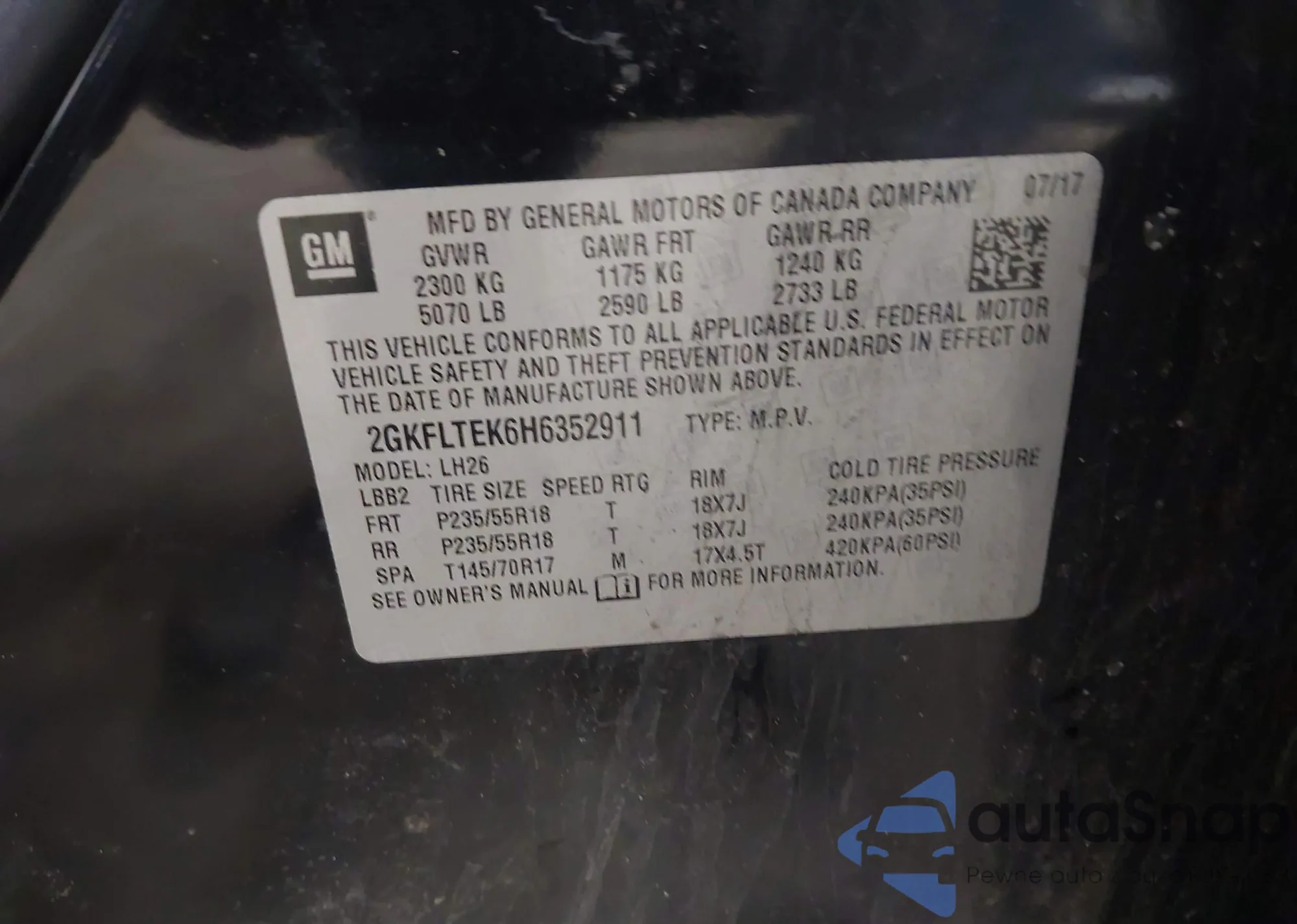 • VIN 2GKFLTEK6H6352911