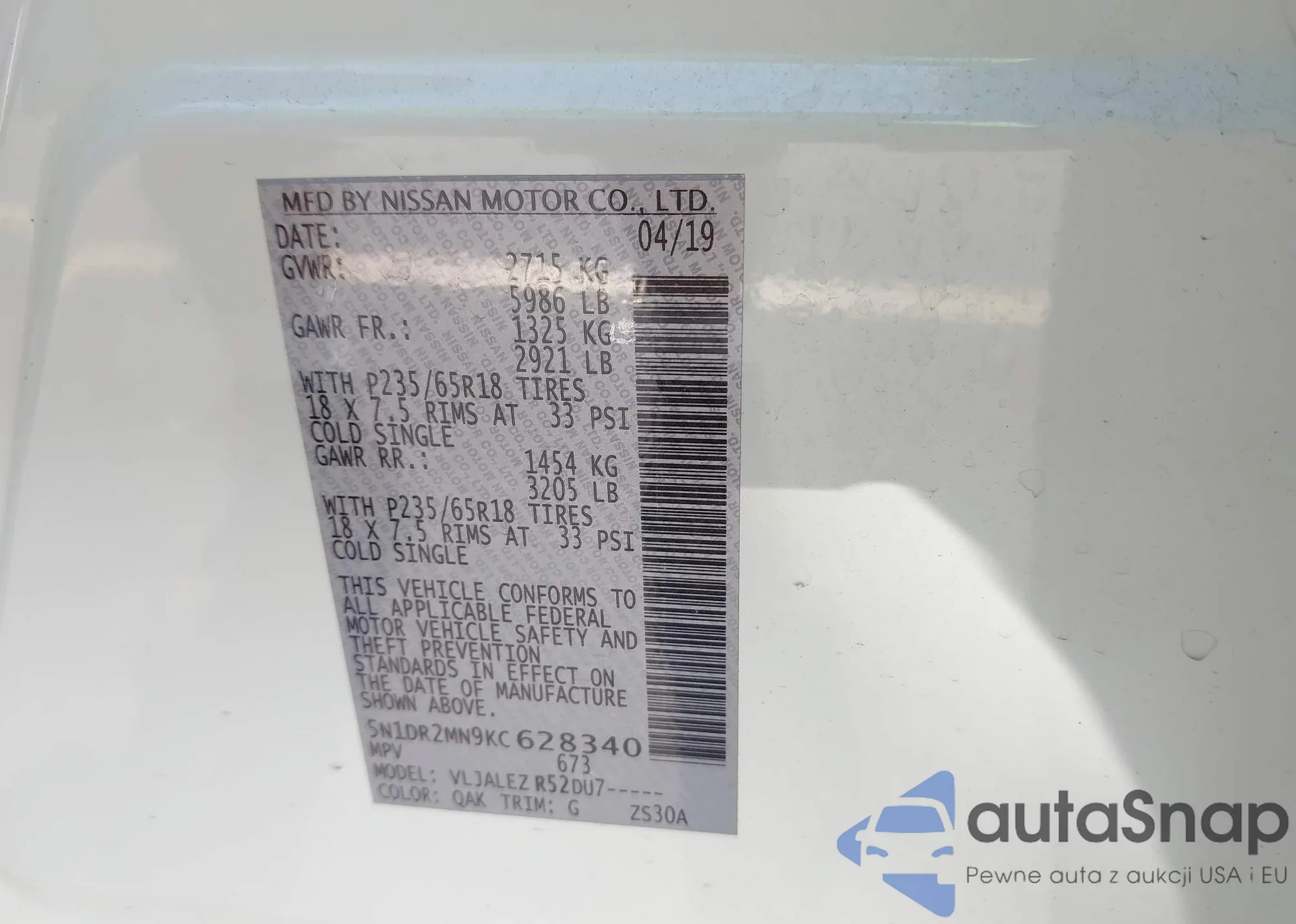 • VIN 5N1DR2MN9KC628340