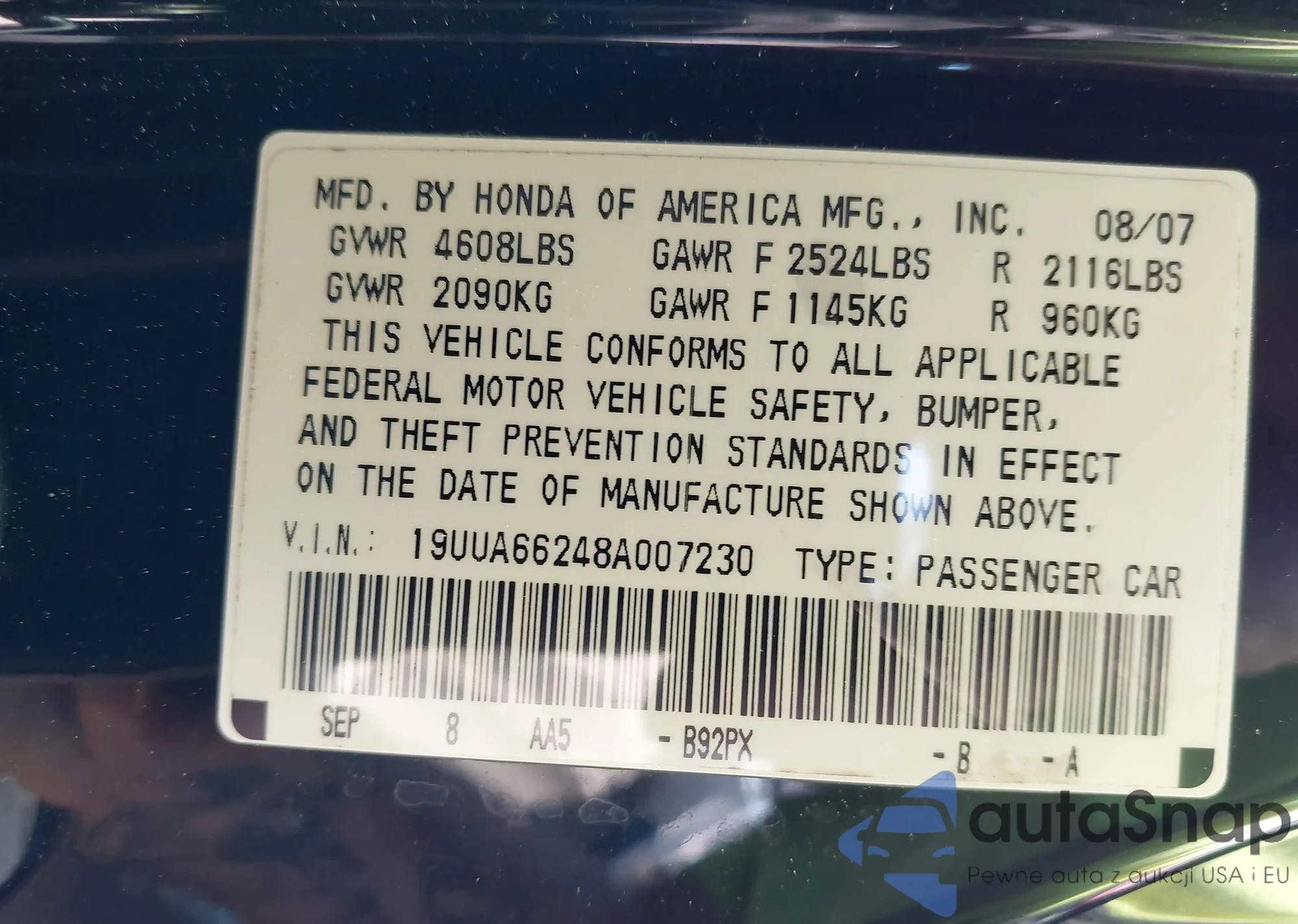 • VIN 19UUA66248A007230