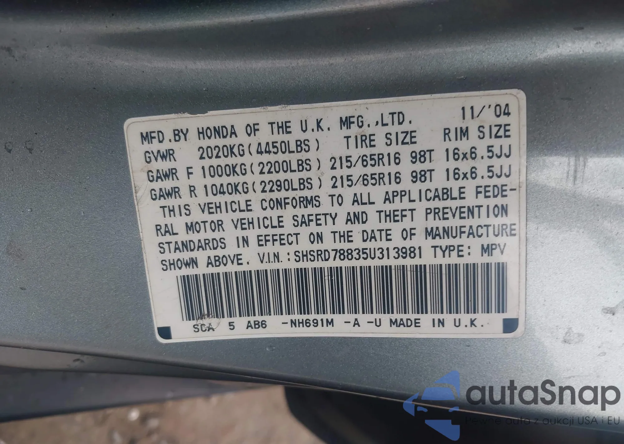 • VIN SHSRD78835U313981