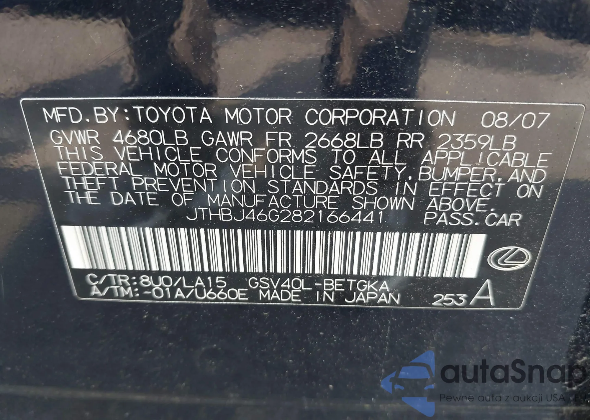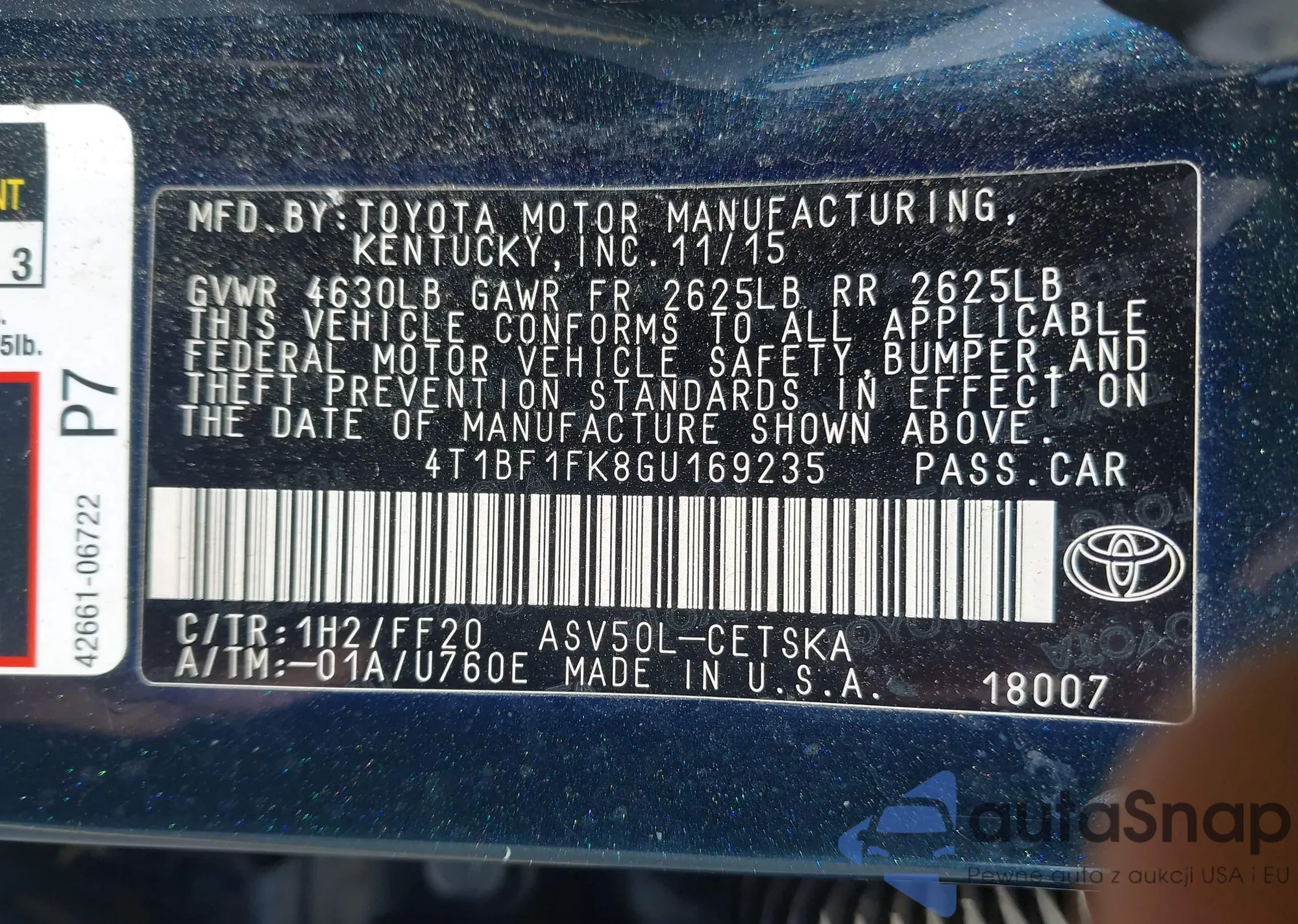 • VIN 4T1BF1FK8GU169235