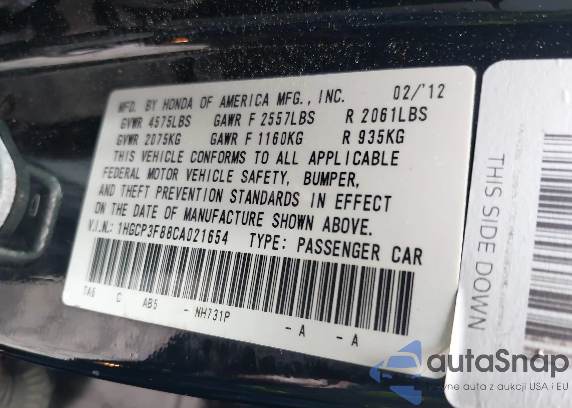 LOT: 42210788 VIN: 1HGCP3F88CA021654