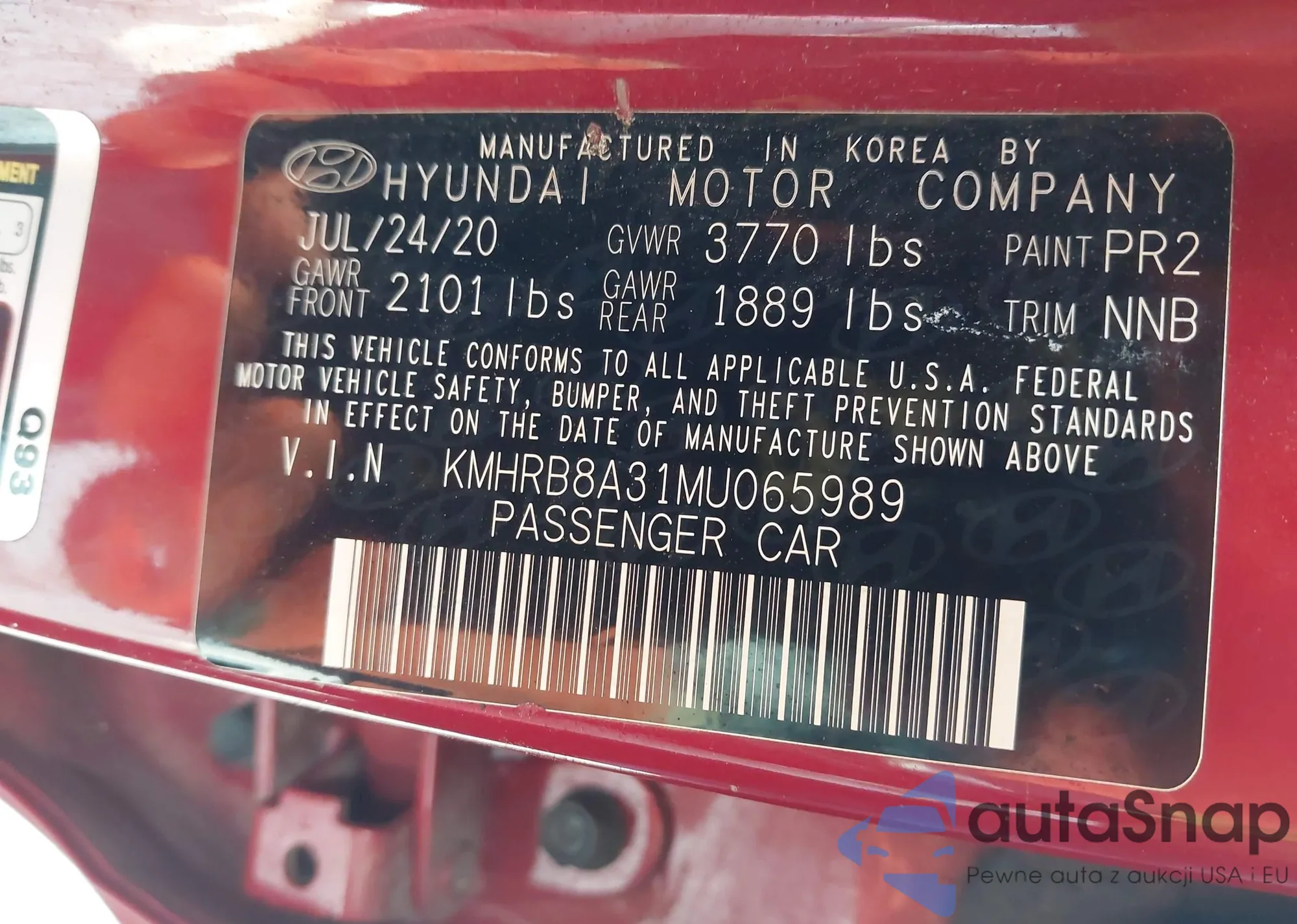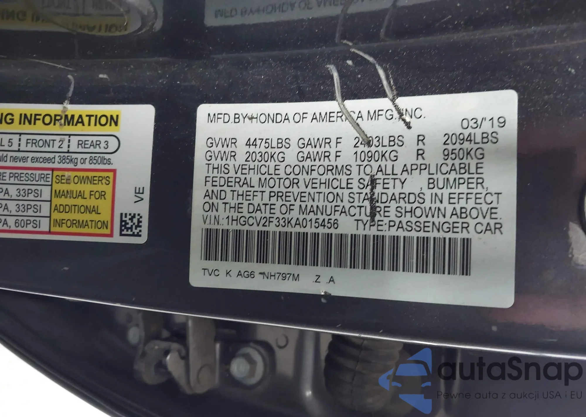 • VIN 1HGCV2F33KA015456