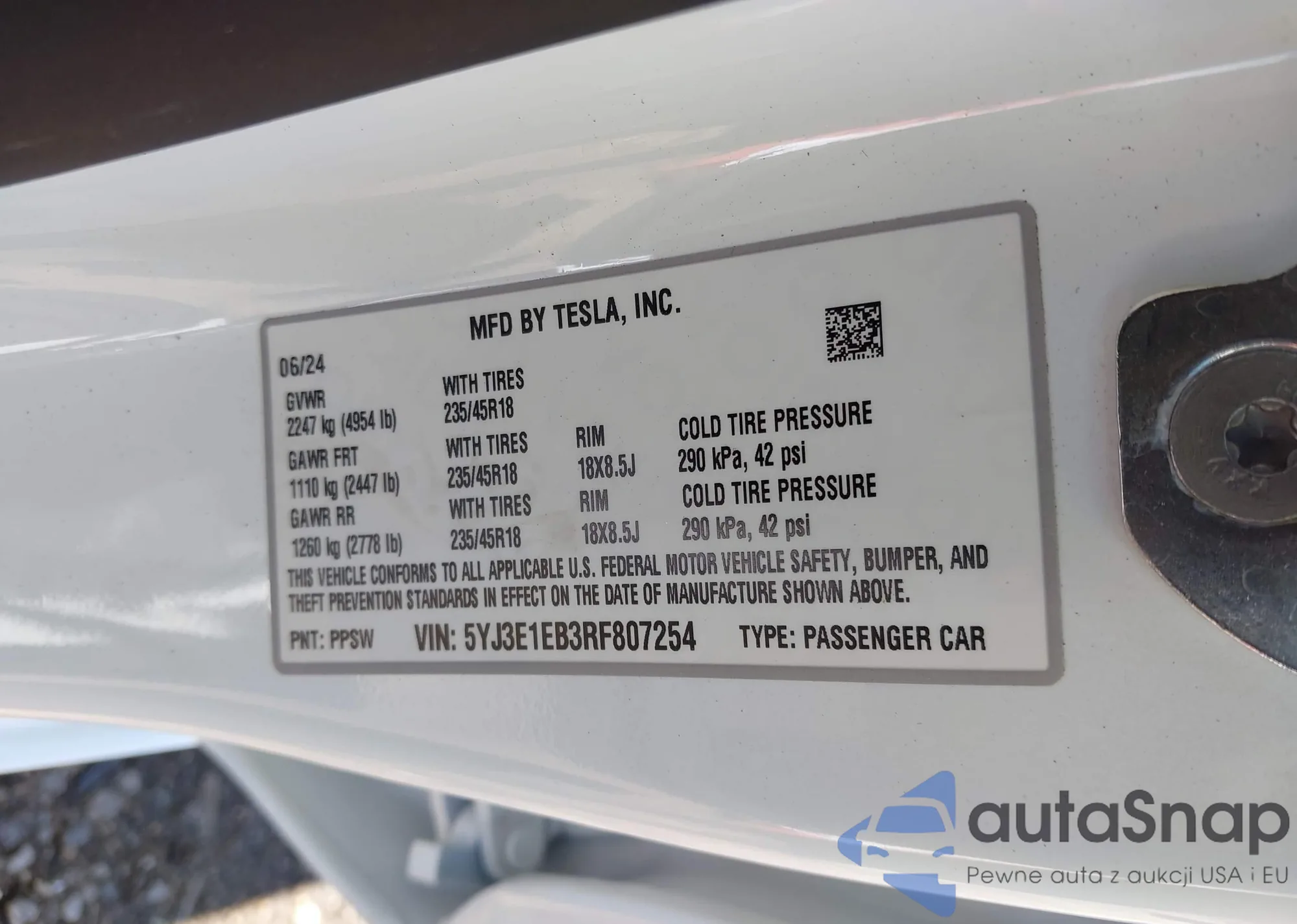 2024 Tesla Model 3 Long Range Dual Motor All-Wheel Drive z USA, uszkodzony, nr VIN 5YJ3E1EB3RF807254