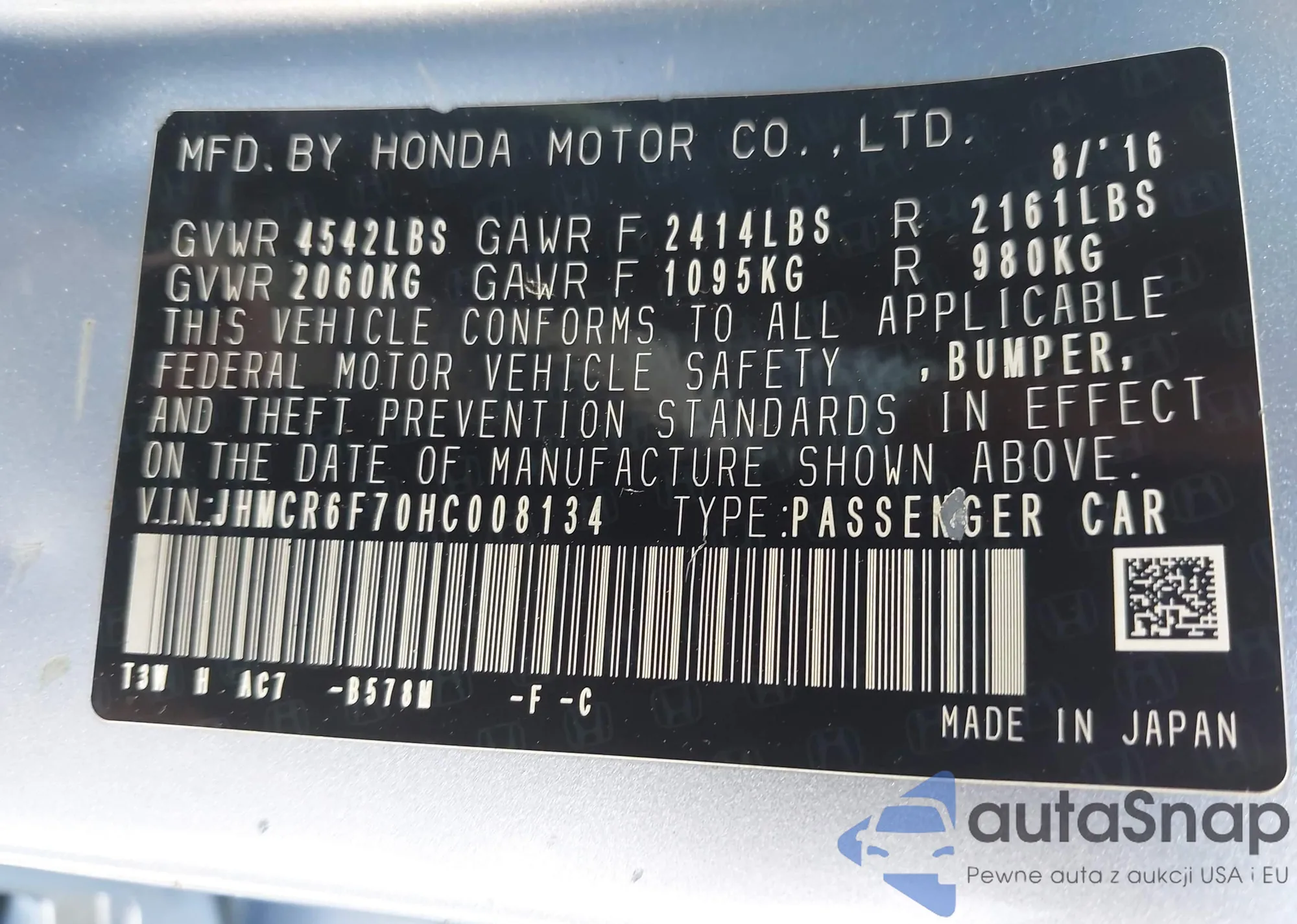 LOT: 42434549 VIN: JHMCR6F70HC008134