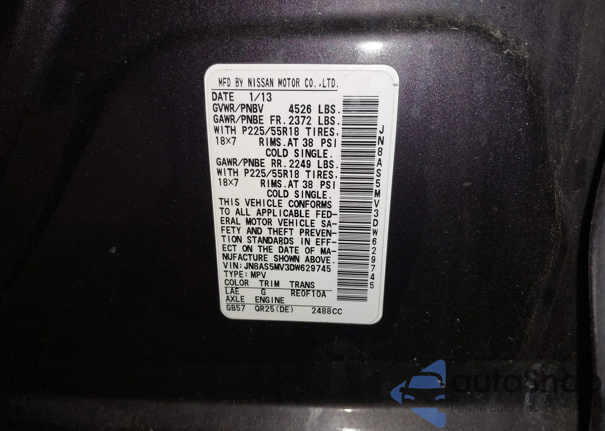 LOT: 42470943 VIN: JN8AS5MV3DW629745