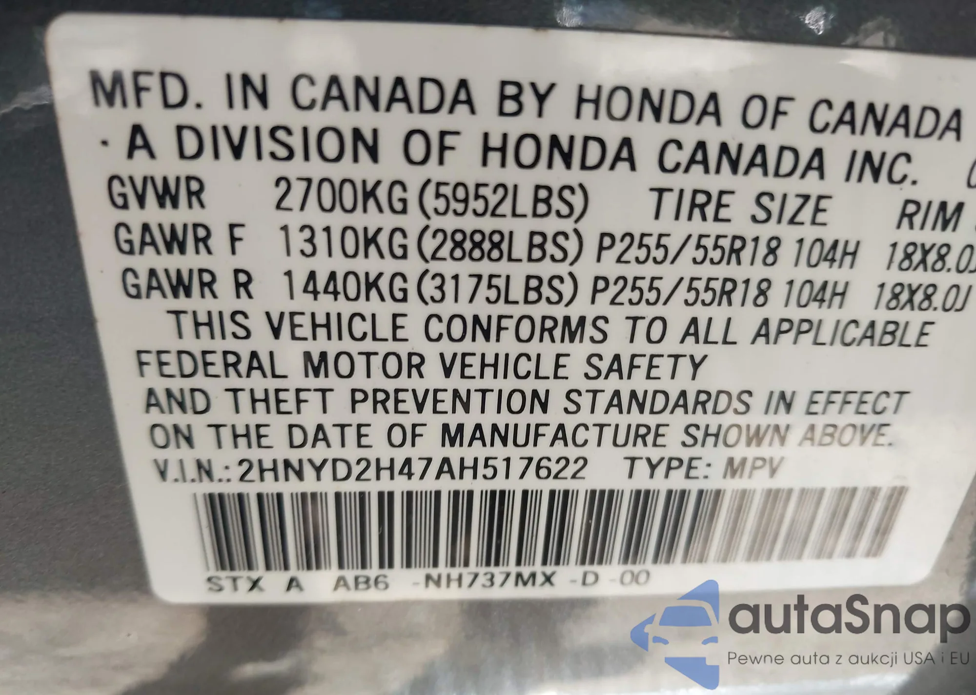 • VIN 2HNYD2H47AH517622