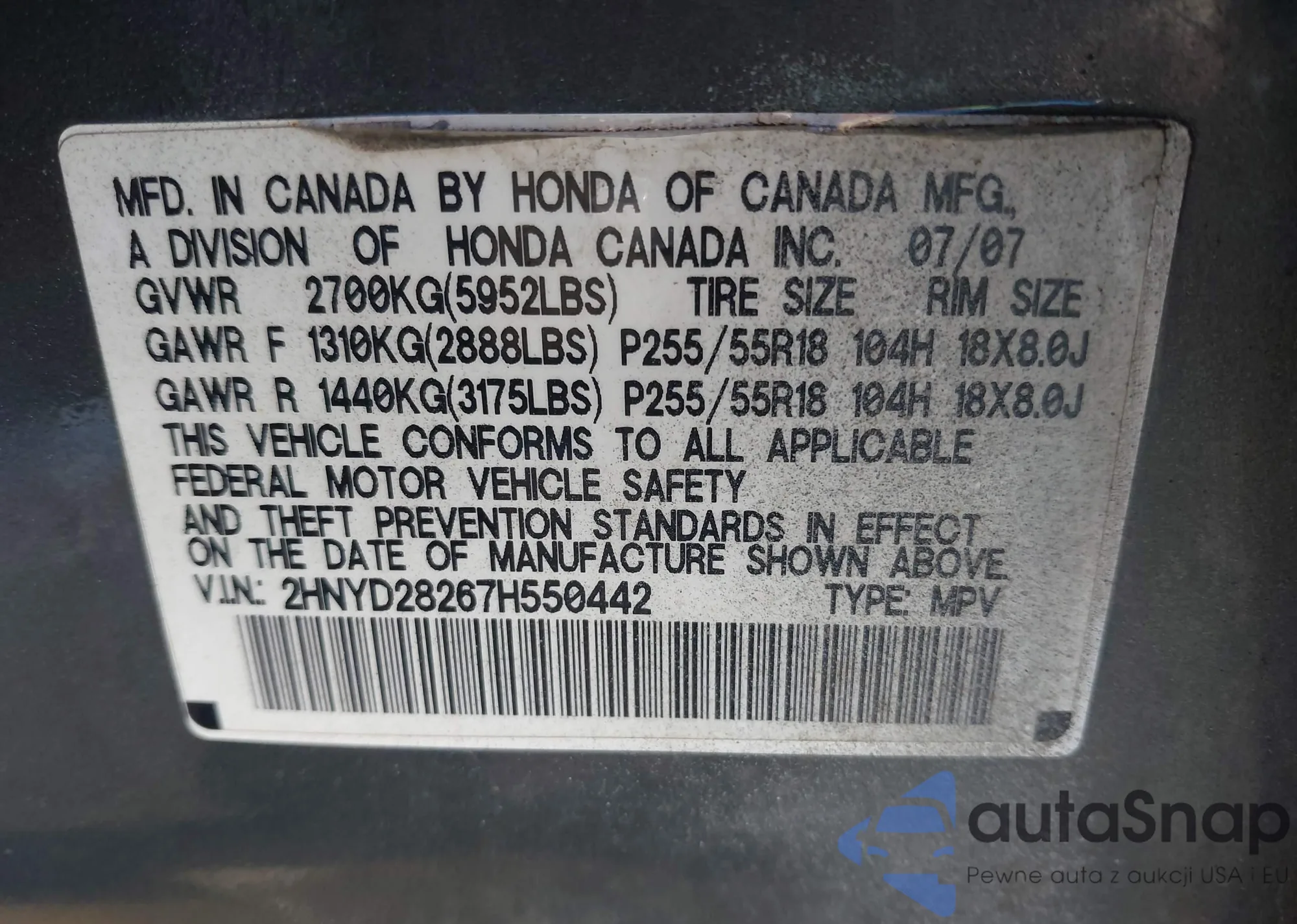 • VIN 2HNYD28267H550442