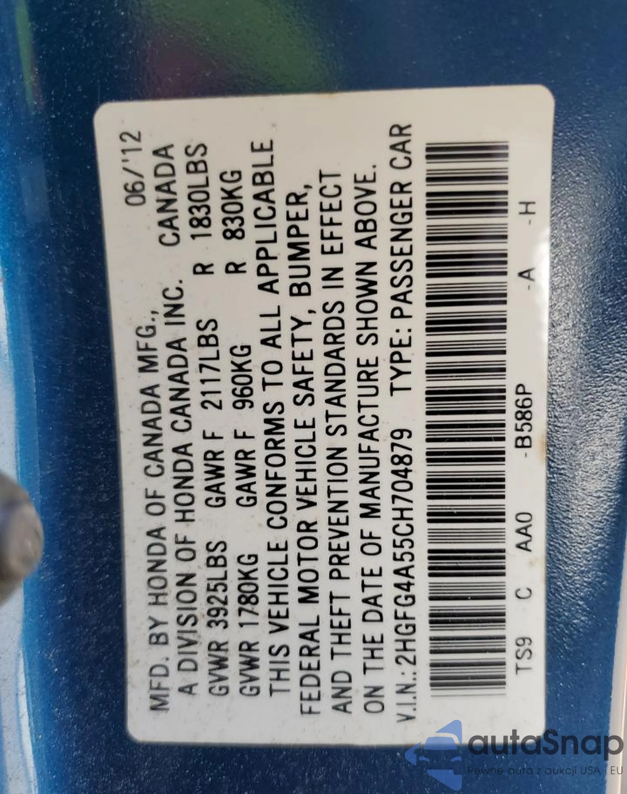 LOT: 61013395 VIN: 2HGFA1F64AH502940