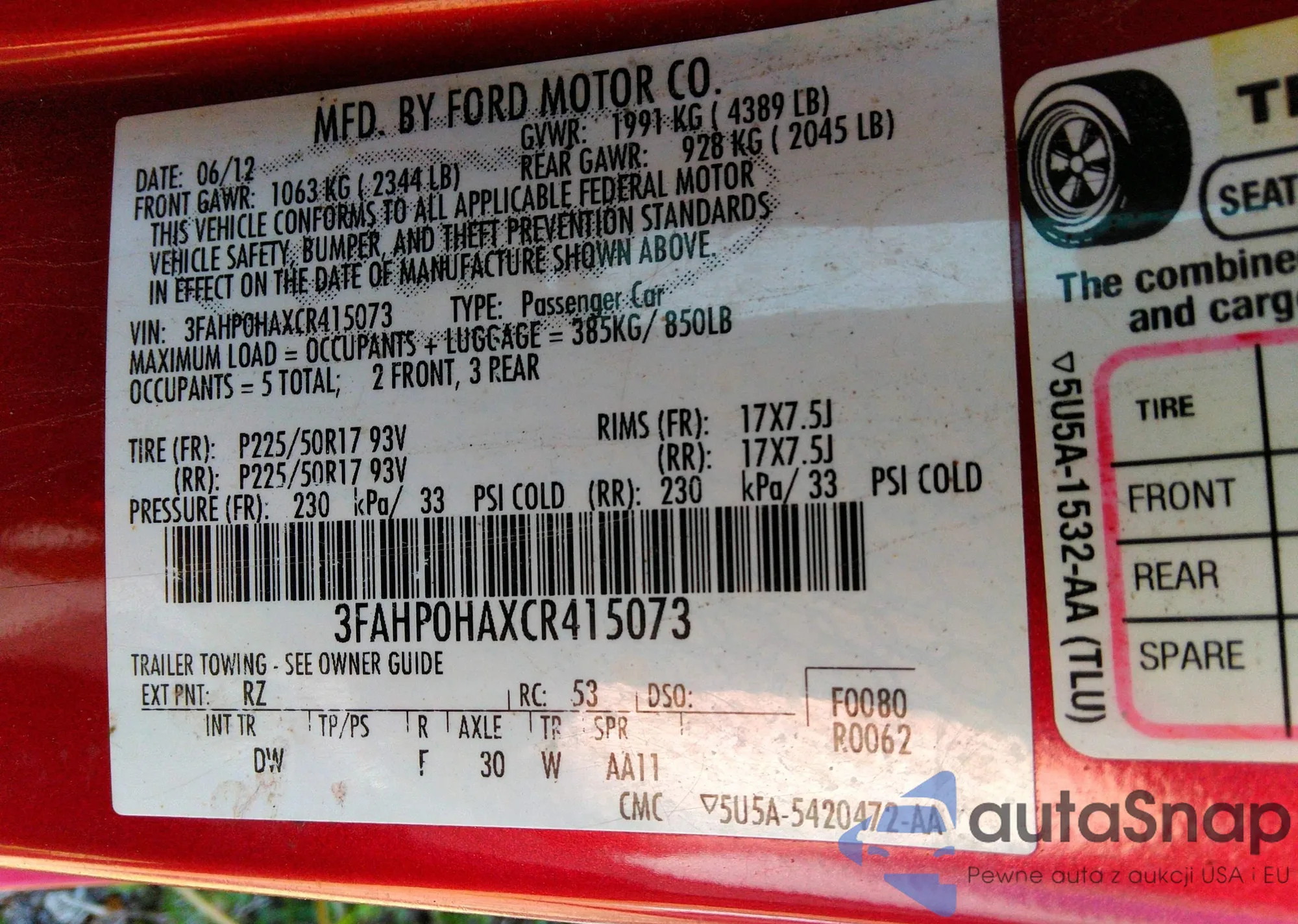 LOT: 41910759 VIN: 3FAHP0HAXCR415073