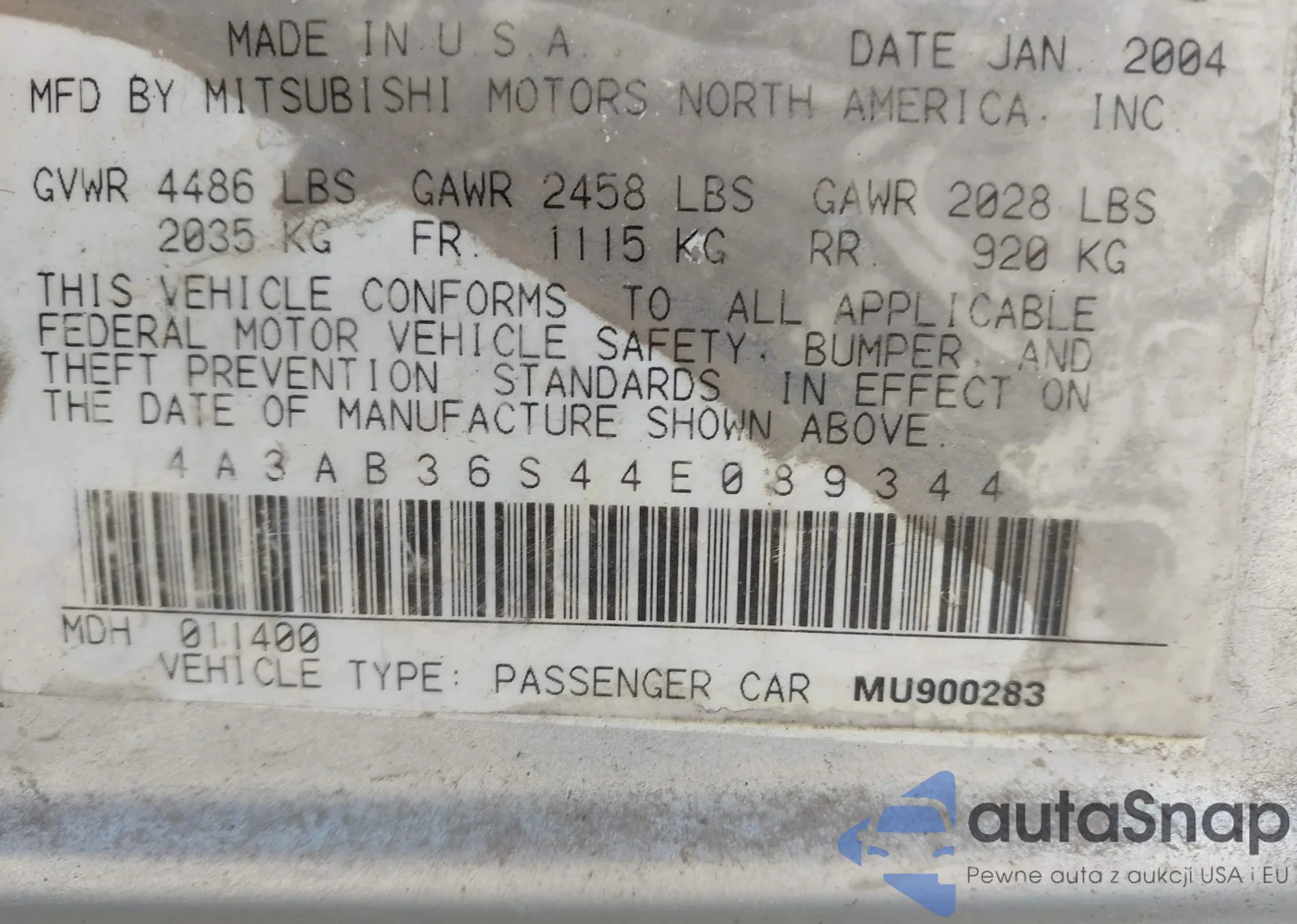 • VIN 4A3AB36S44E089344