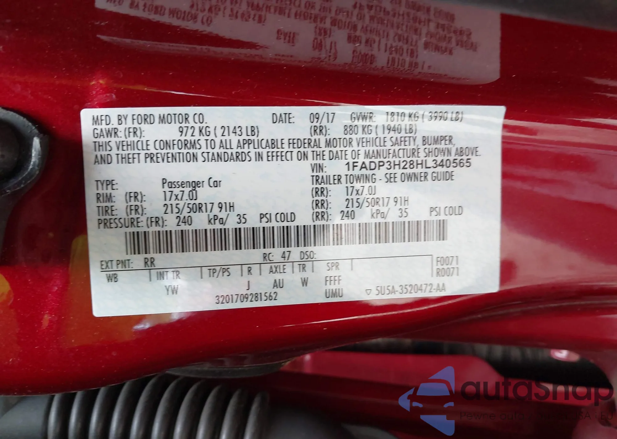 LOT: 42271542 VIN: 1FADP3H28HL340565