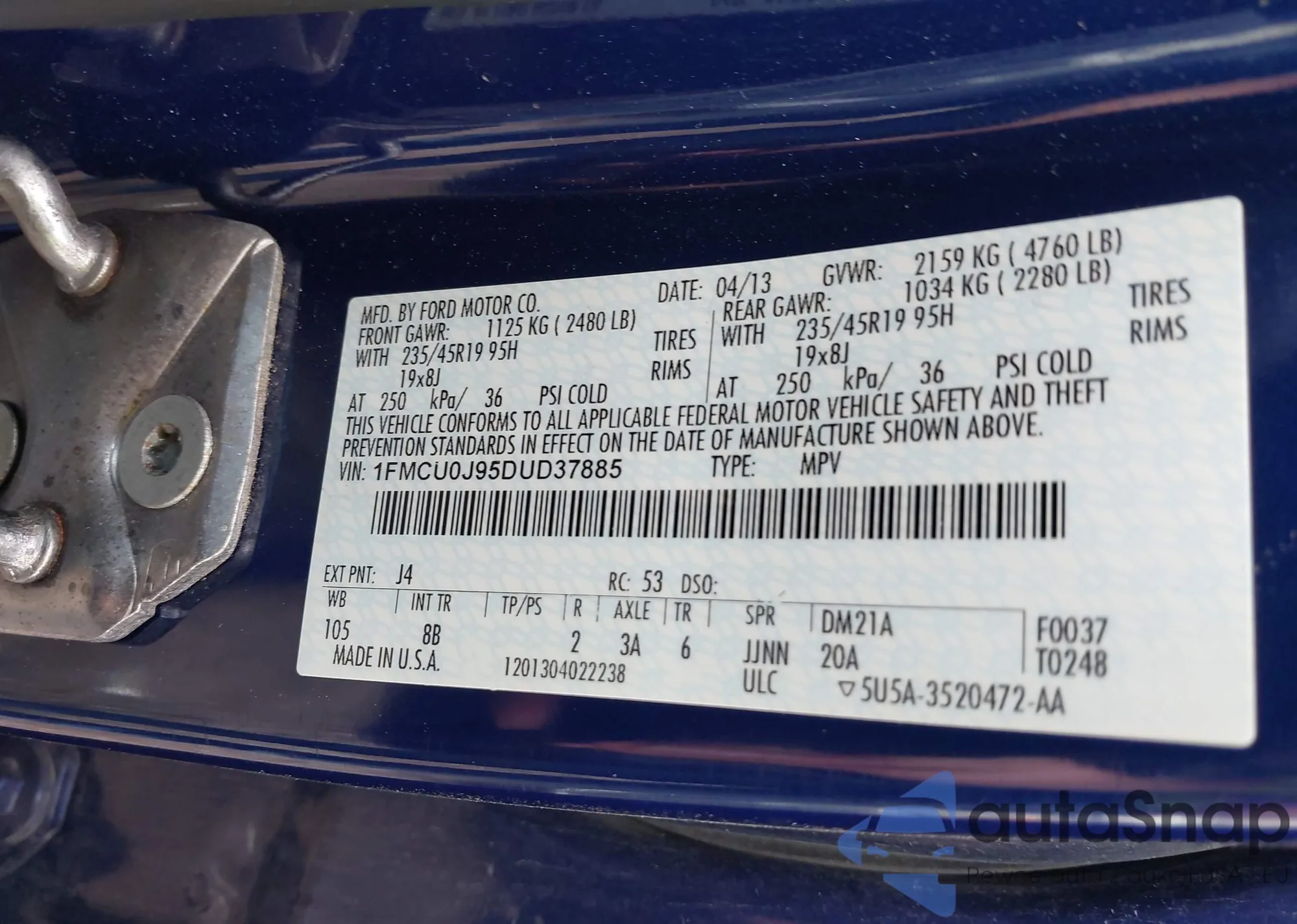 • VIN 1FMCU0J95DUD37885