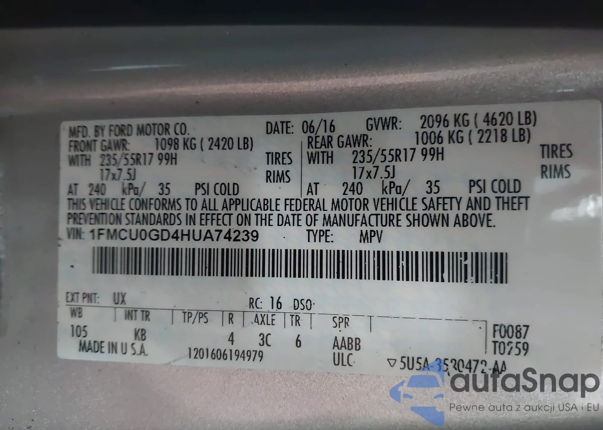 LOT: 42451456 VIN: 1FMCU0GD4HUA74239