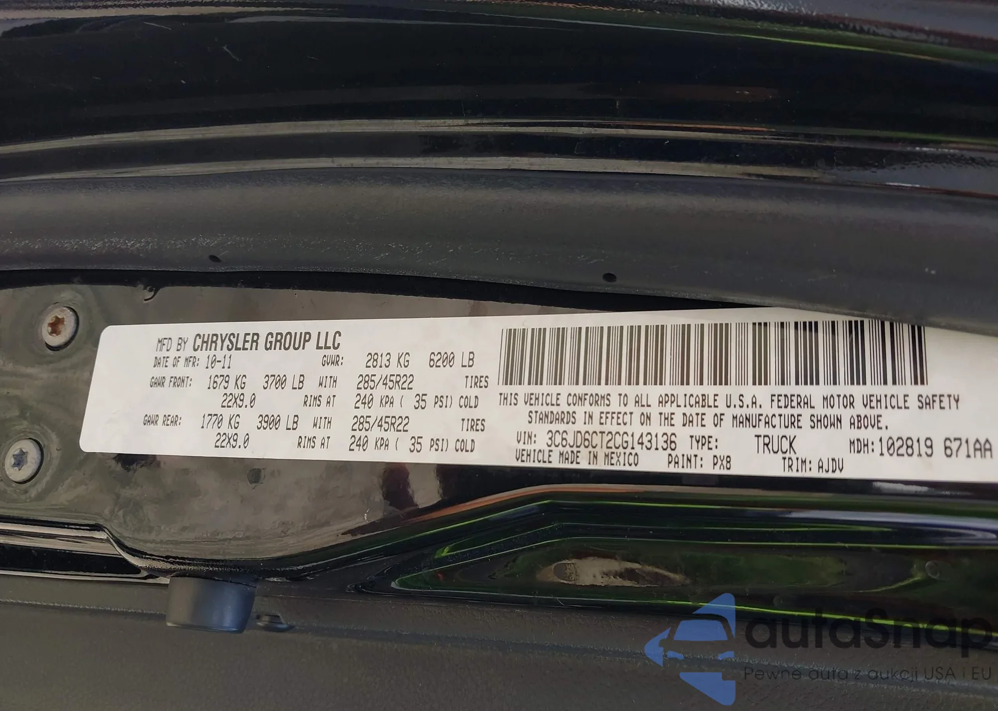 • VIN 3C6JD6CT2CG143136