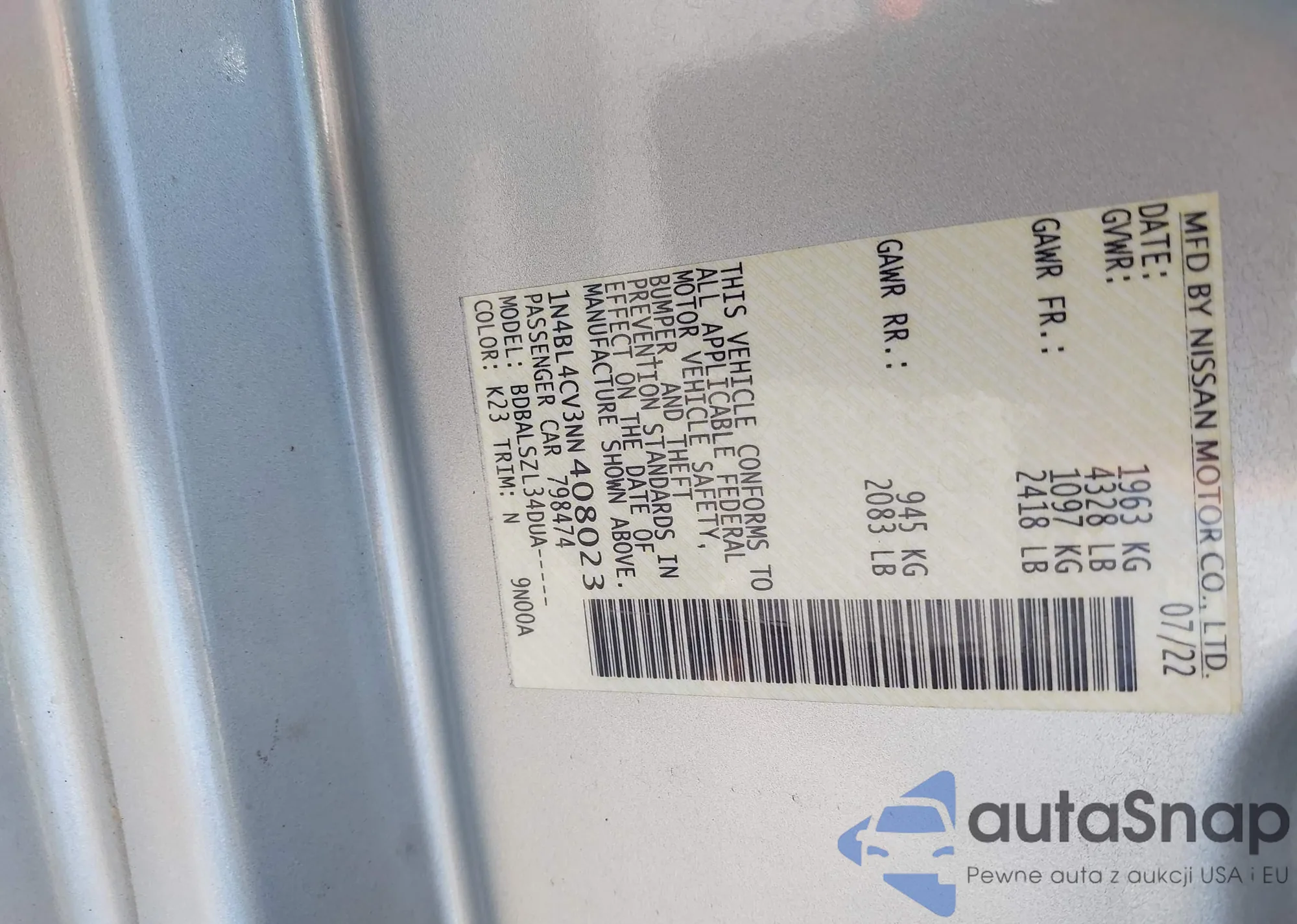 LOT: 42406177 VIN: 1N4BL4CV3NN408023