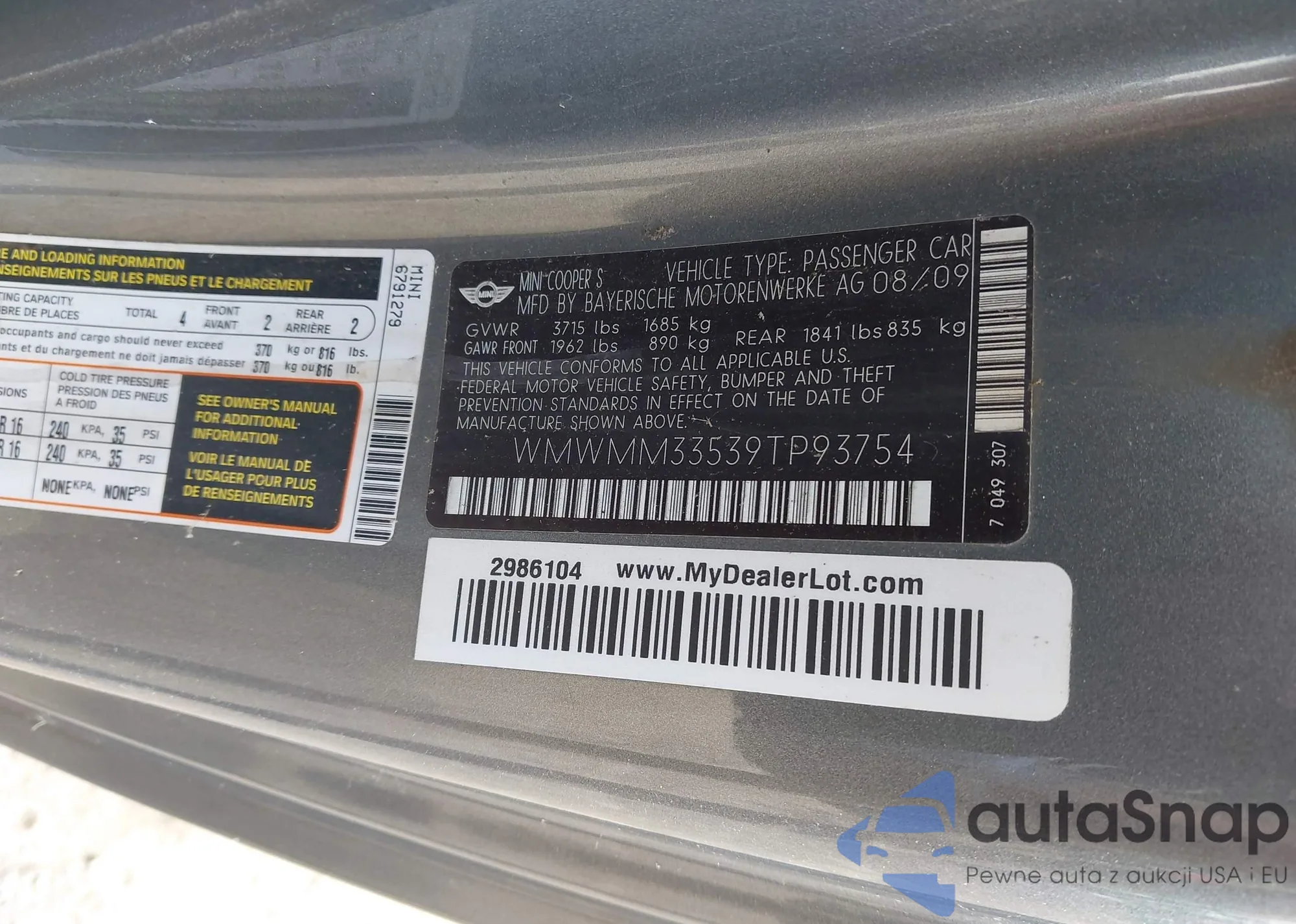 LOT: 42511573 VIN: WMWMM433539TP9375