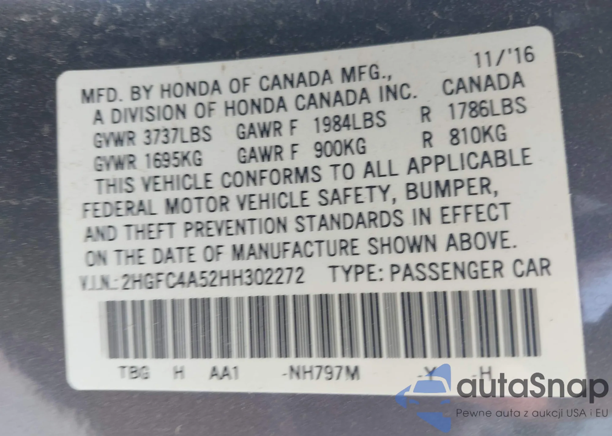• VIN 2HGFC4A52HH302272