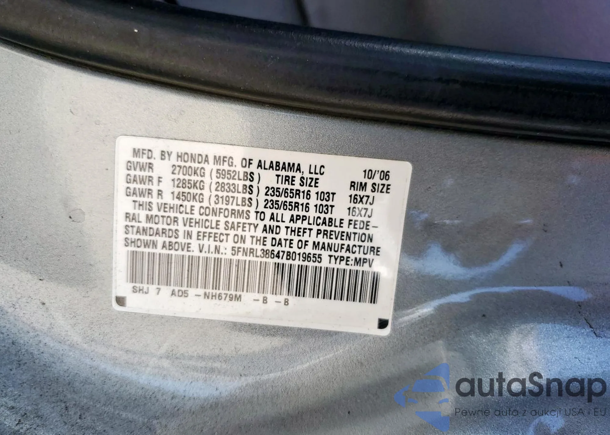 • VIN 5FNYF4H28AB025813