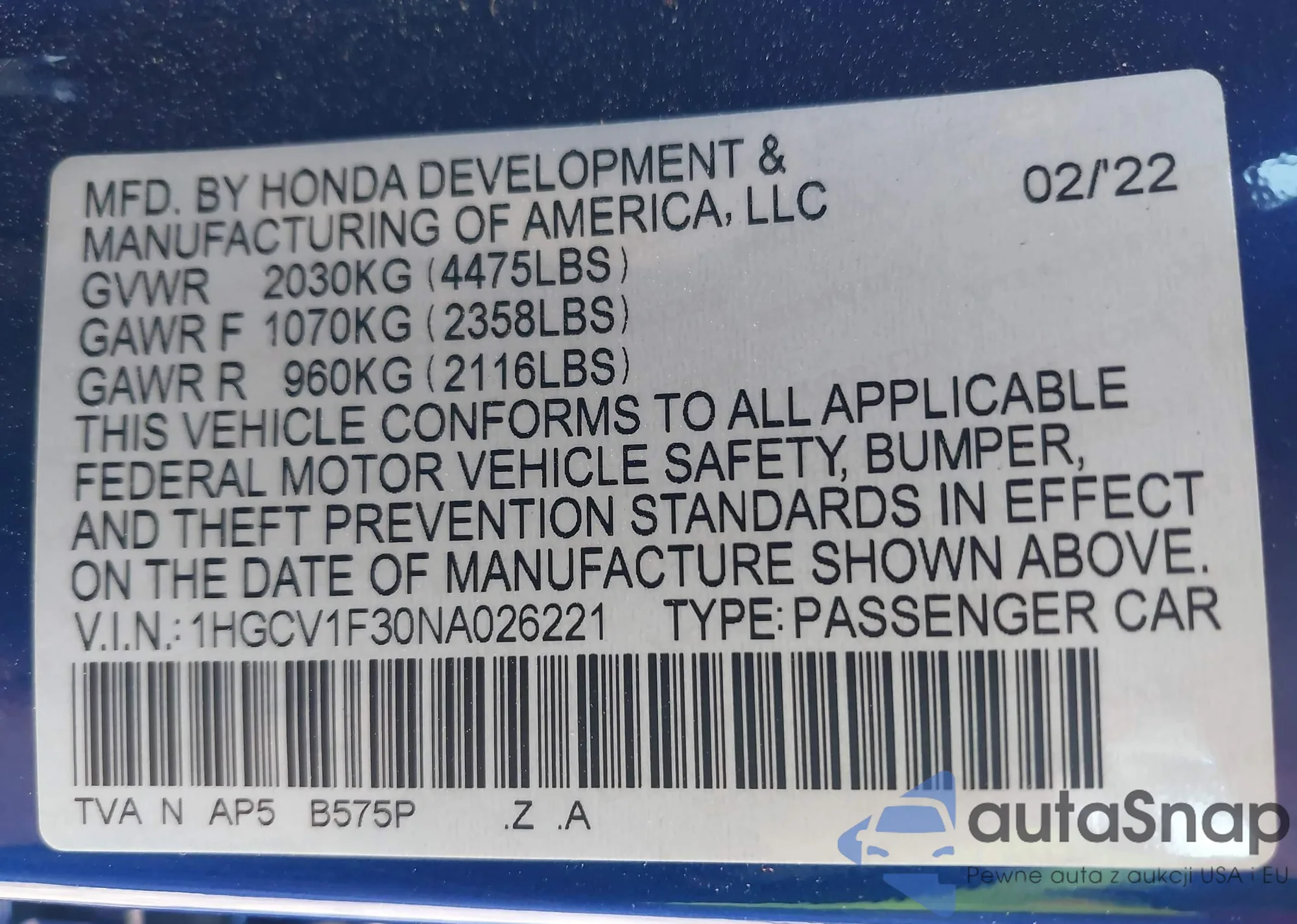 • VIN 1HGCV1F30NA026221