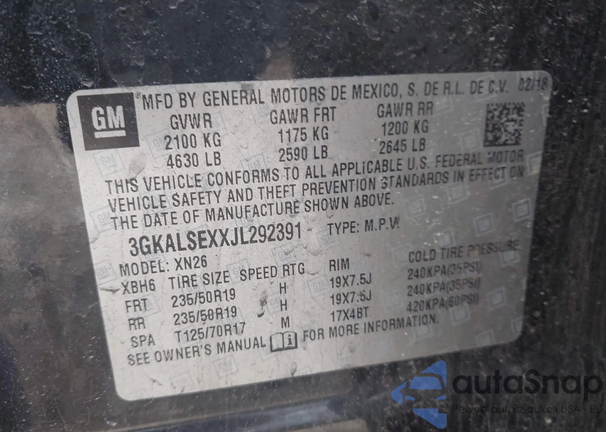 LOT: 42230973 VIN: 3GKALSEXXJL292391