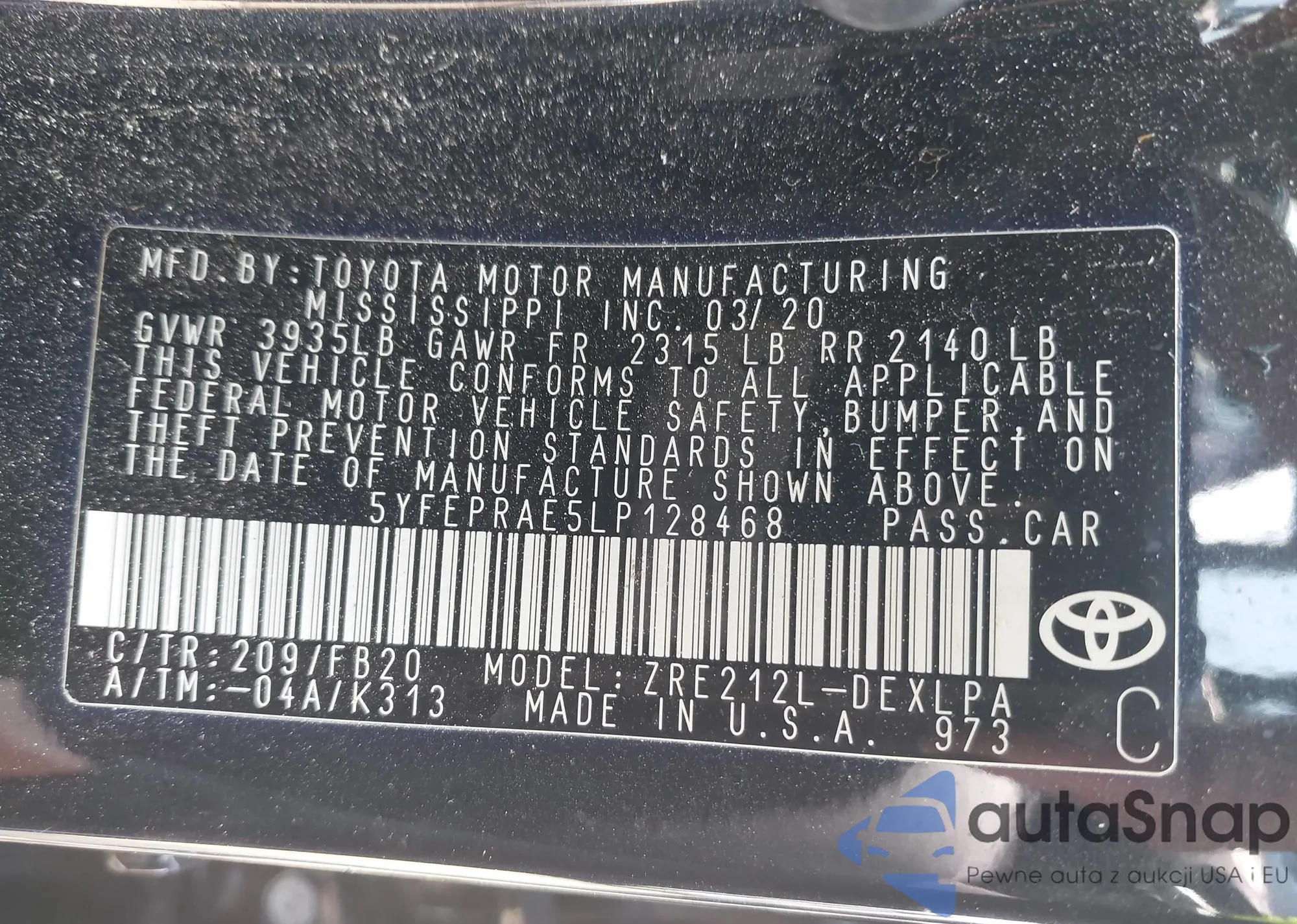 LOT: 42401250 VIN: 5YFEPRAE5LP128468