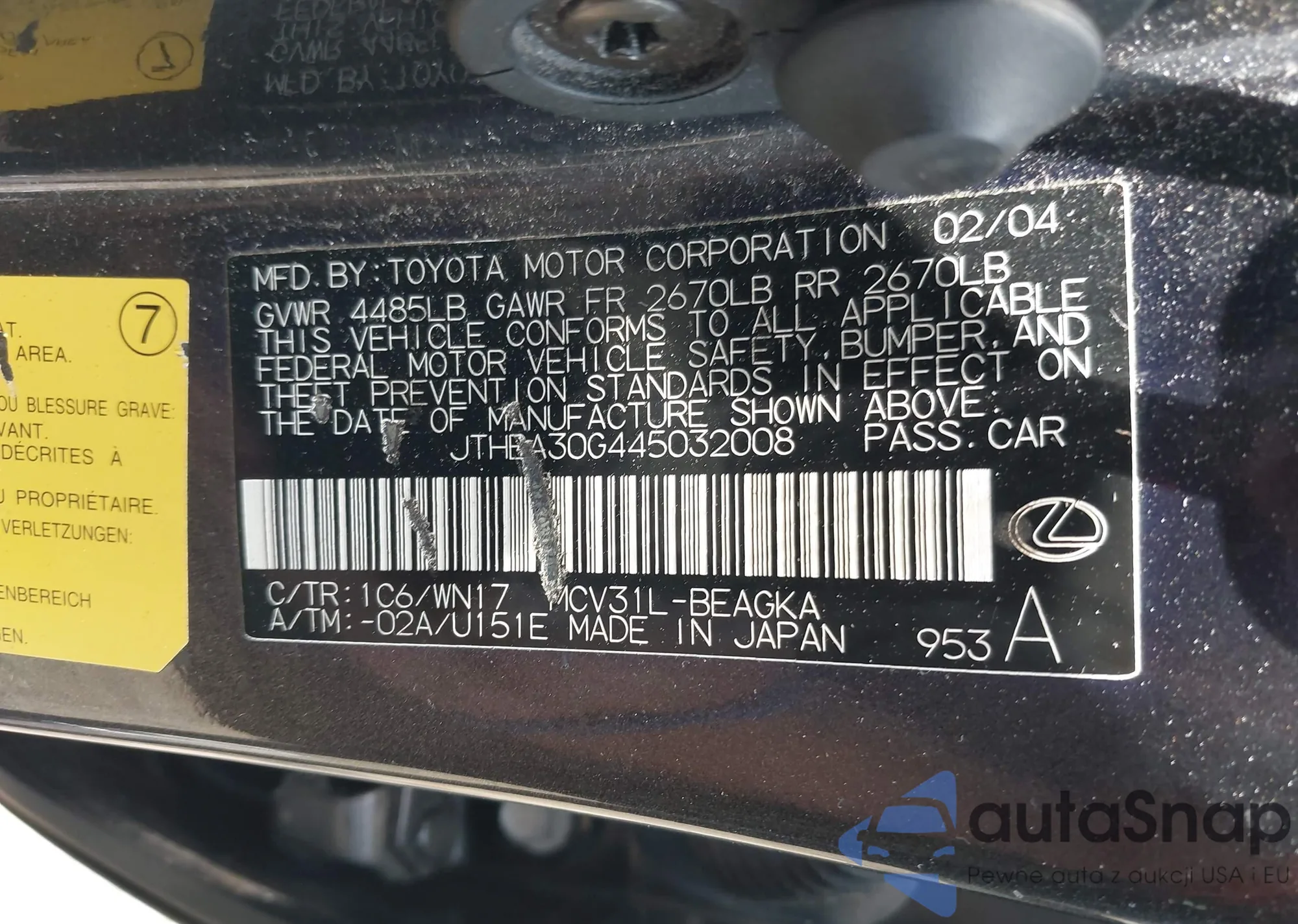 LOT: 42425210 VIN: JTHBA30G445032008