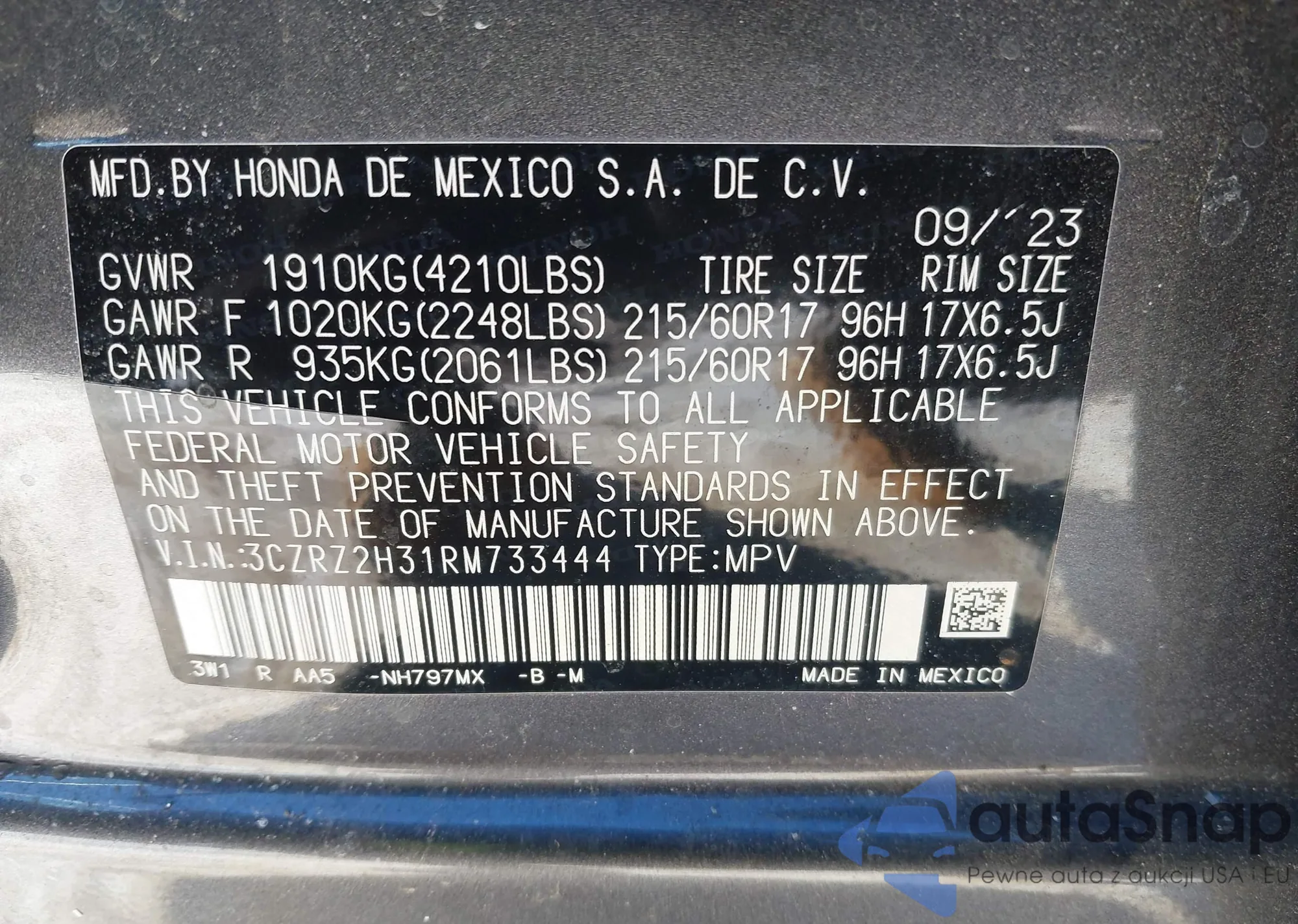 LOT: 42139638 VIN: 1HGCY1F31PA001077