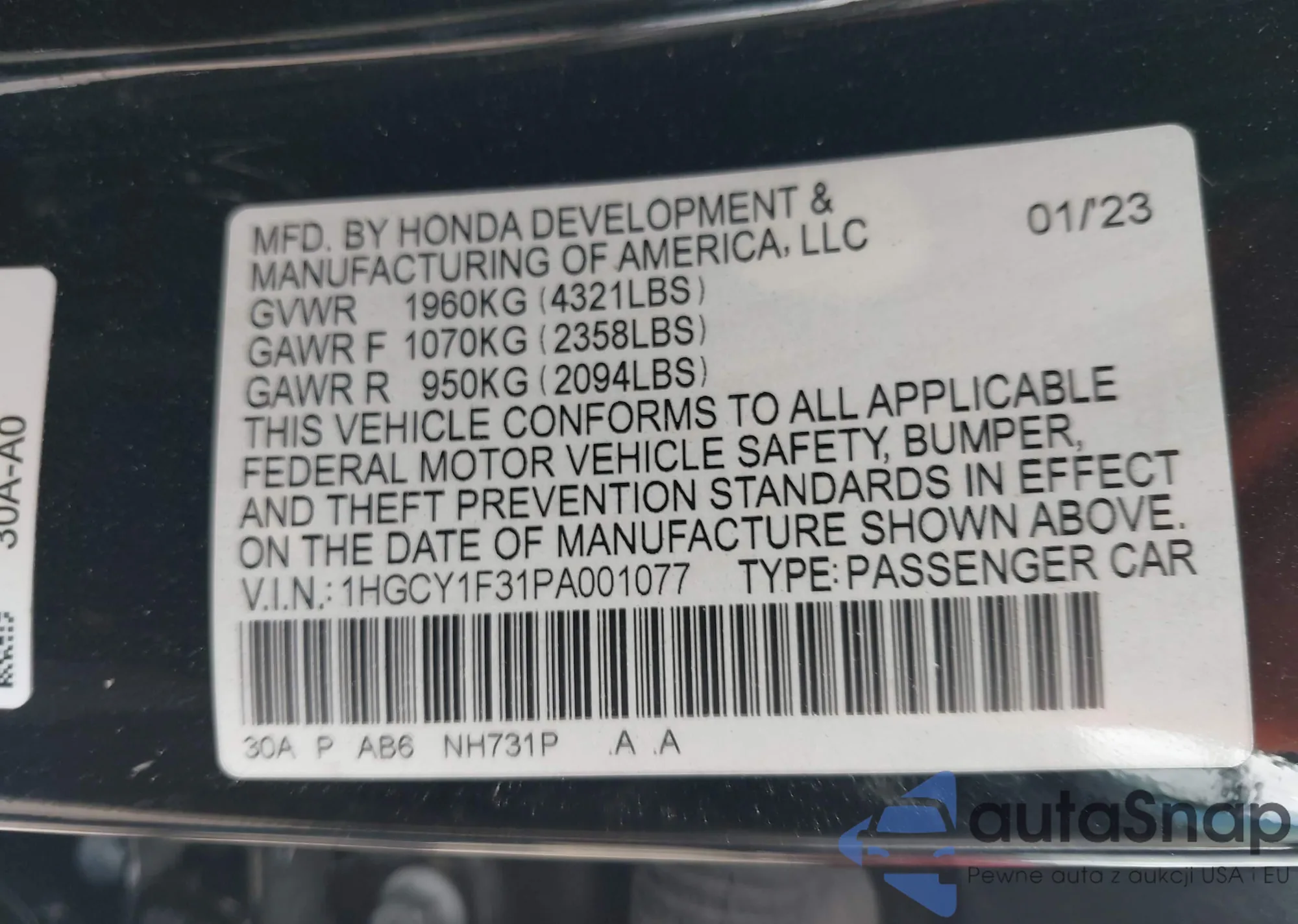 • VIN 1HGCY1F31PA001077