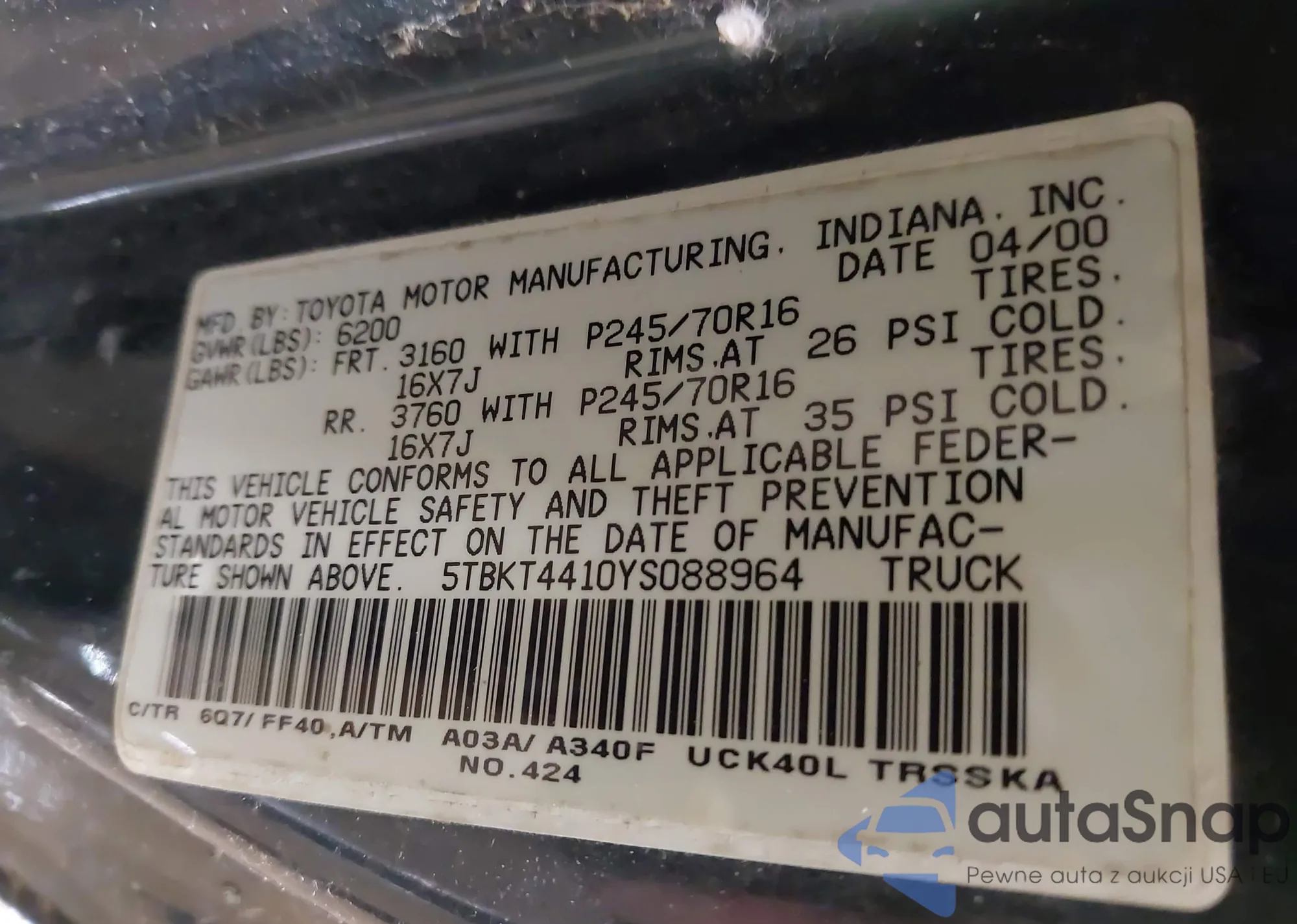 2000 Toyota Tundra Sr5 z USA, uszkodzony, nr VIN 5TBKT4410YS088964