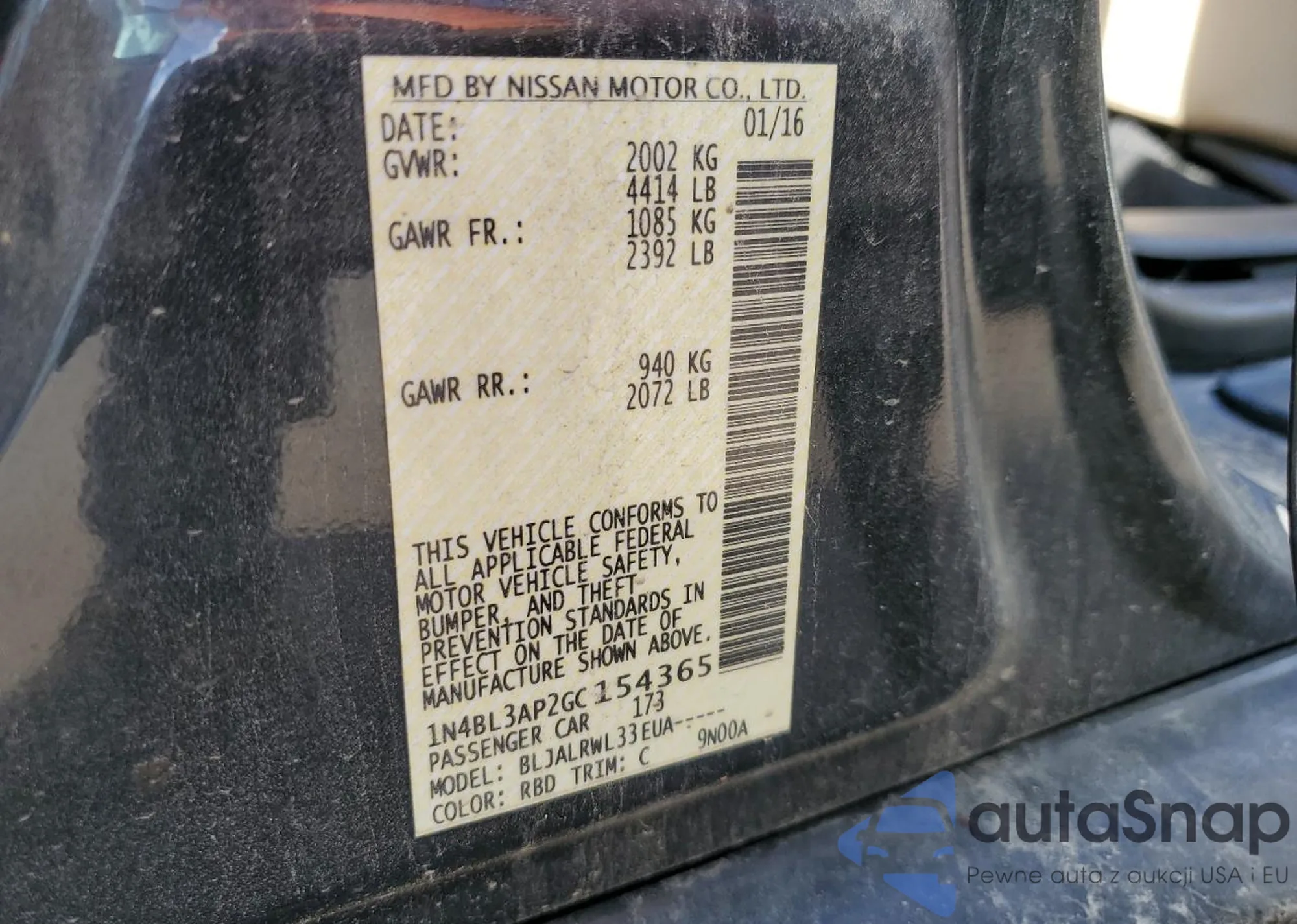 • VIN 1N4BL3AP2GC154365