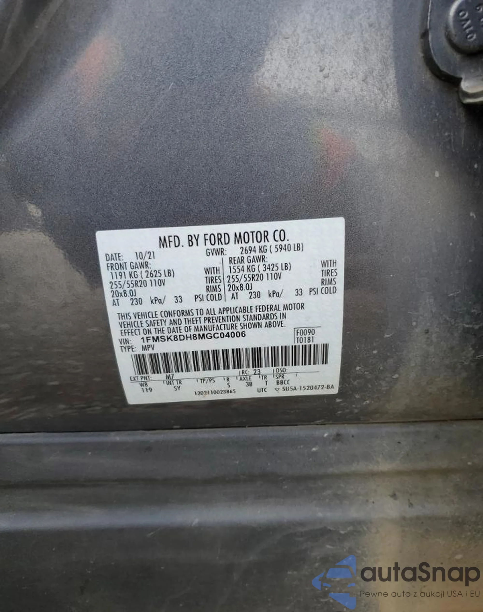 LOT: 58135745 VIN: 1FMSK8DH8MGC04006