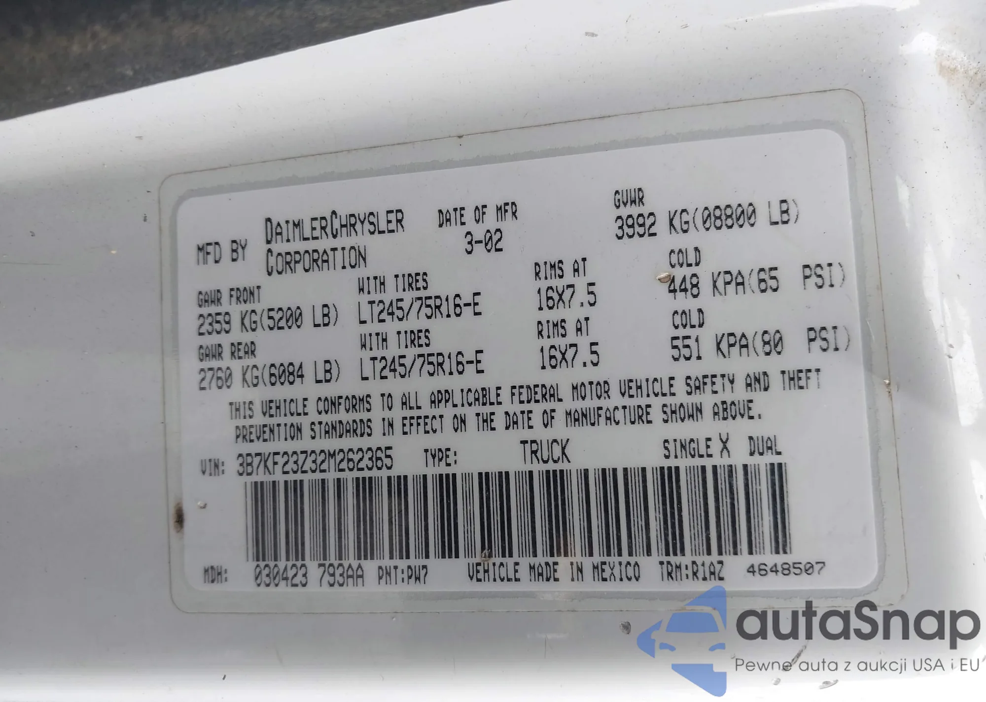 • VIN 3B7KF23Z32M262365