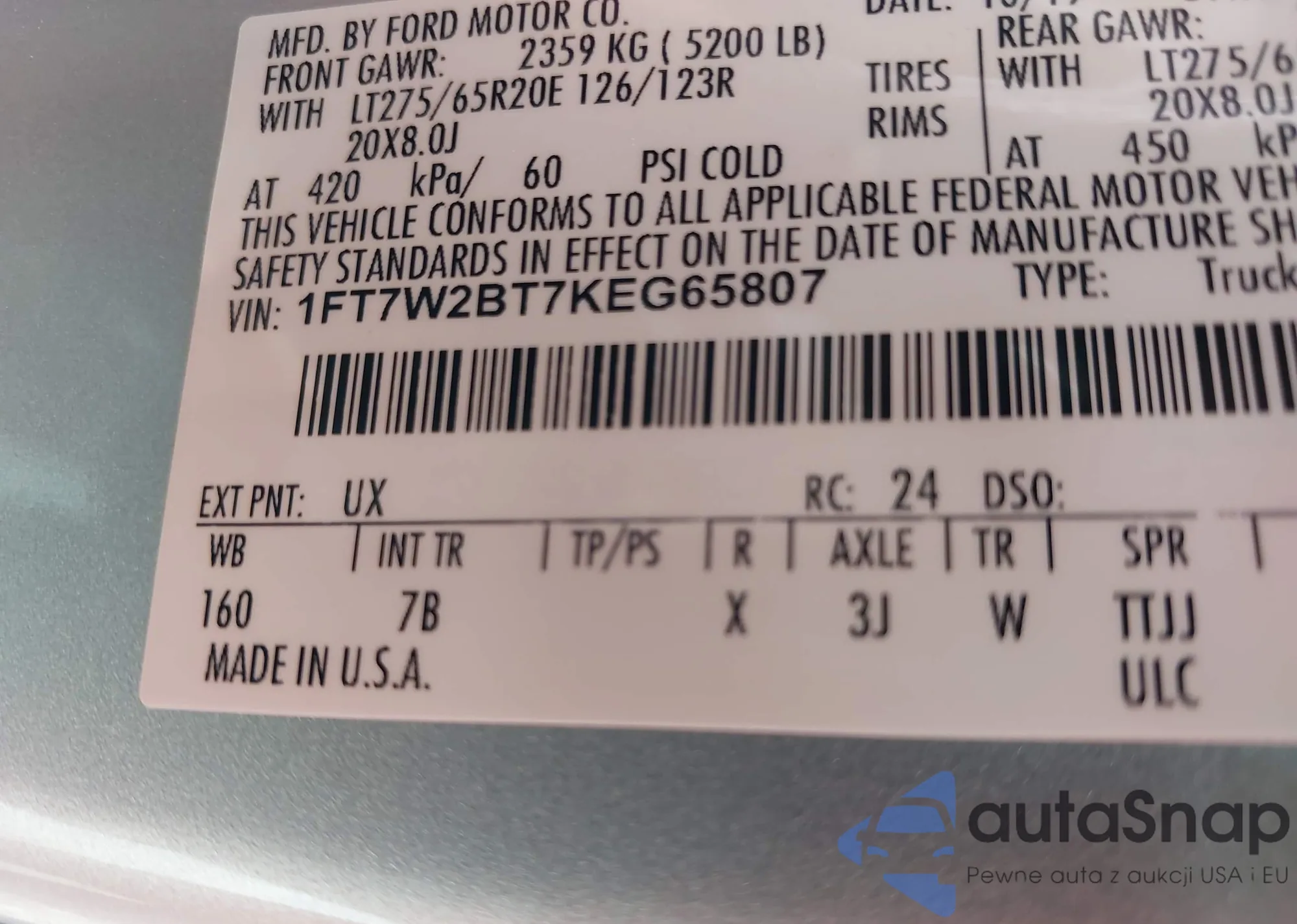 LOT: 42311452 VIN: 1FT7W2BT7KEG65807