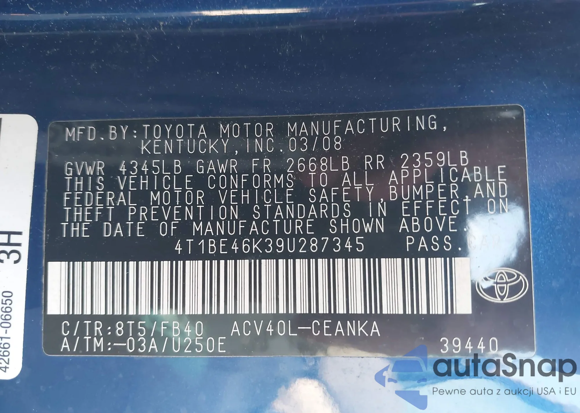 • VIN 4T1BE46K39U287345