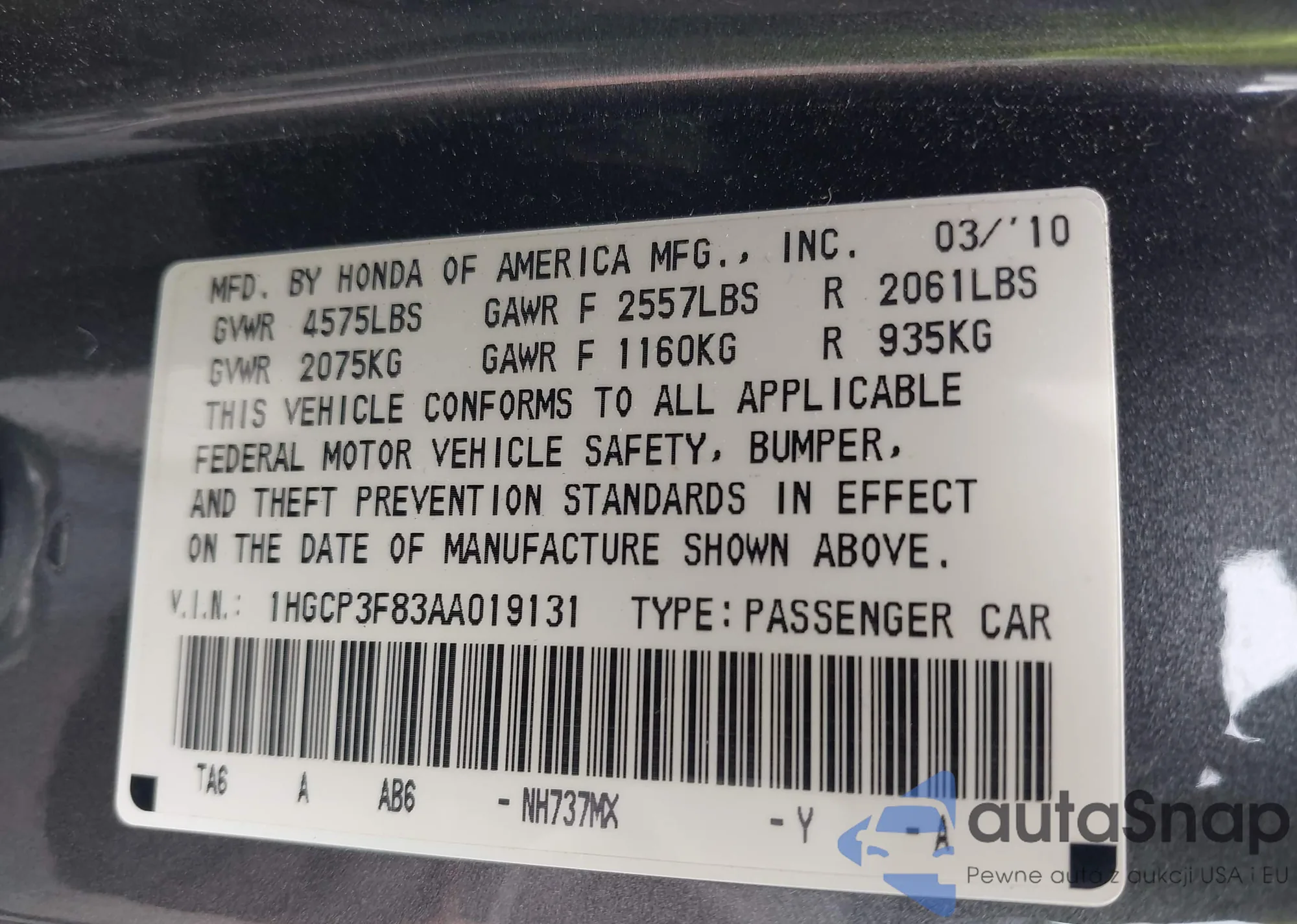 LOT: 42633778 VIN: 1HGCP3F83AA019131