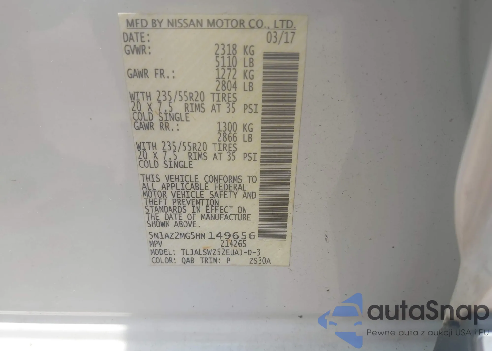 LOT: 42423817 VIN: 5N1AZ2MG5HN149656
