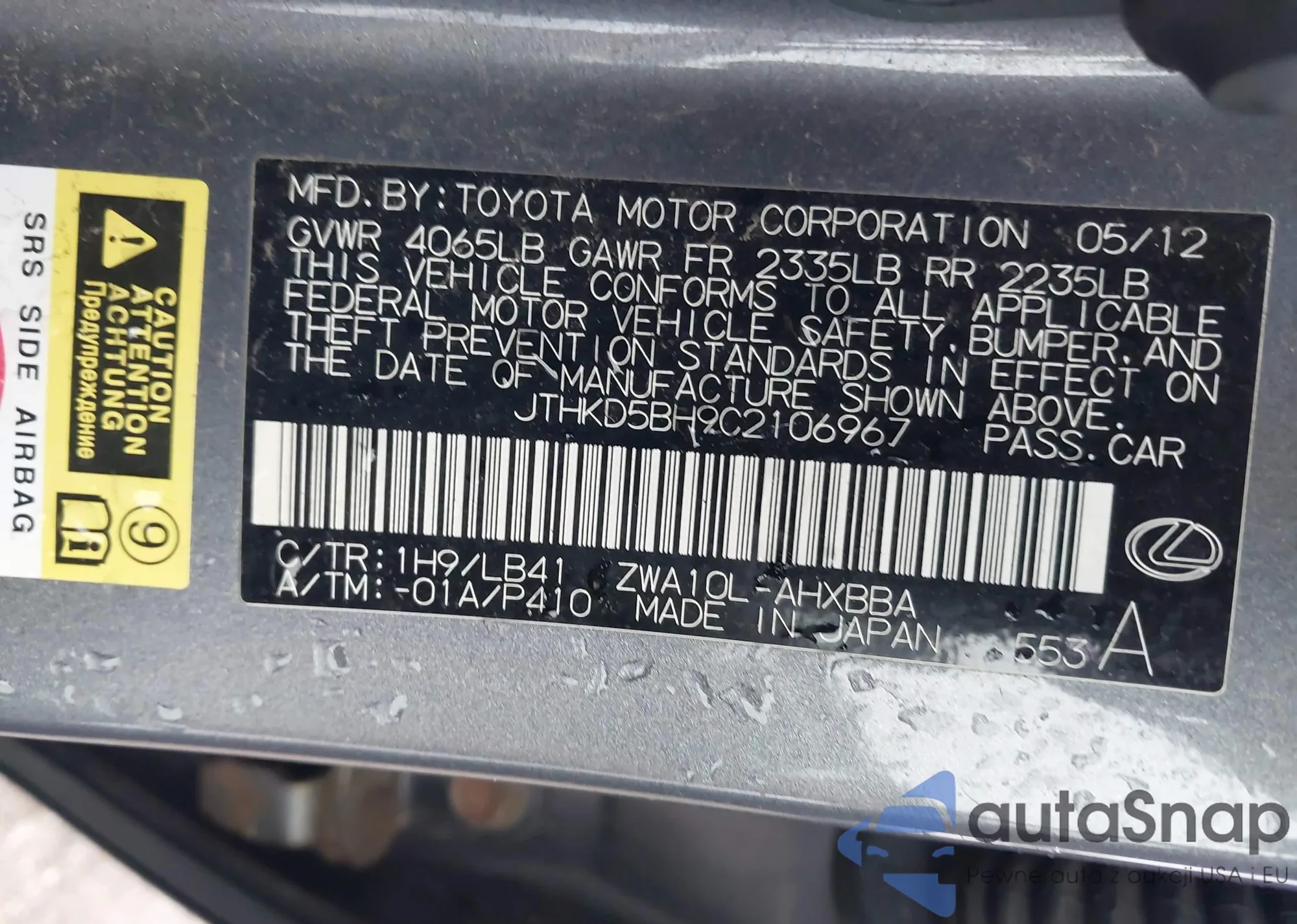 LOT: 42085137 VIN: JTHKD5BH9C2106967